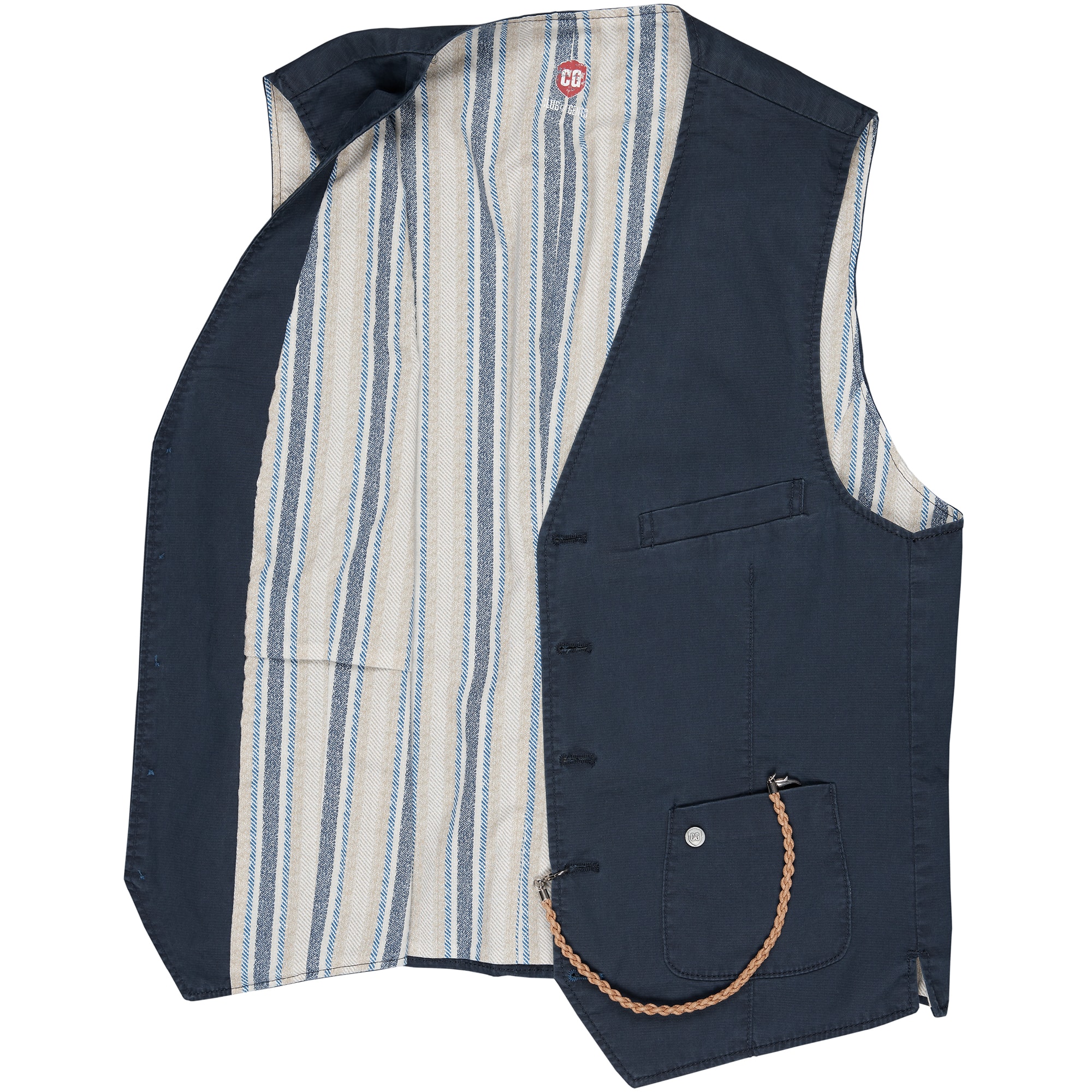 Passform: slim fit, Rückenlänge ca. 61,9 cm in Größe 50, Umlaufweite ca. 105,6 cm in Größe 50, Oberstoffrücken, Ohne Revers, Brusttasche, 5 Schließknöpfe (der untere bleibt immer offen), Aufgesetzte Taschen, Taschenuhrenkette, Streifenfutter