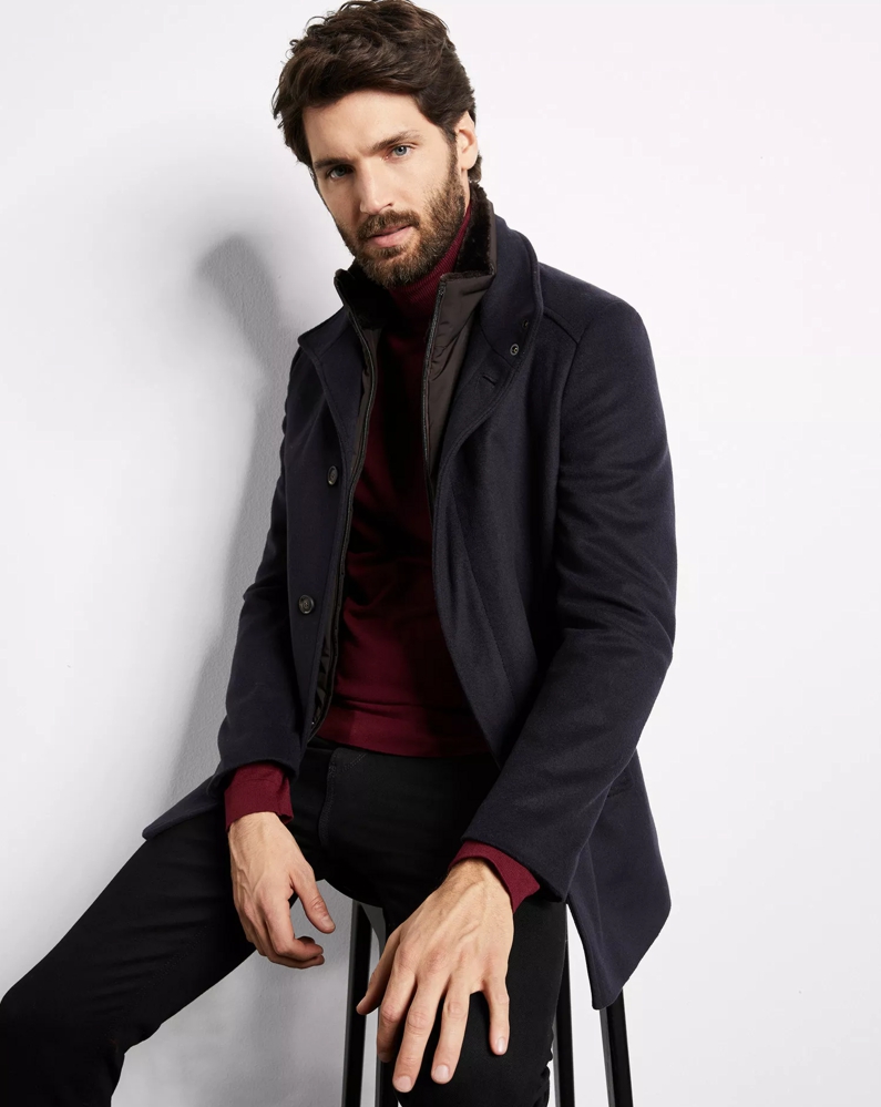Modern geschnittene Wolljacke mit Stehkragen. Mit dem Webfellkragen entsteht eine 2 in 1 Optik. Ideal für das Businessoutfit über dem Sakko oder den Anzug.