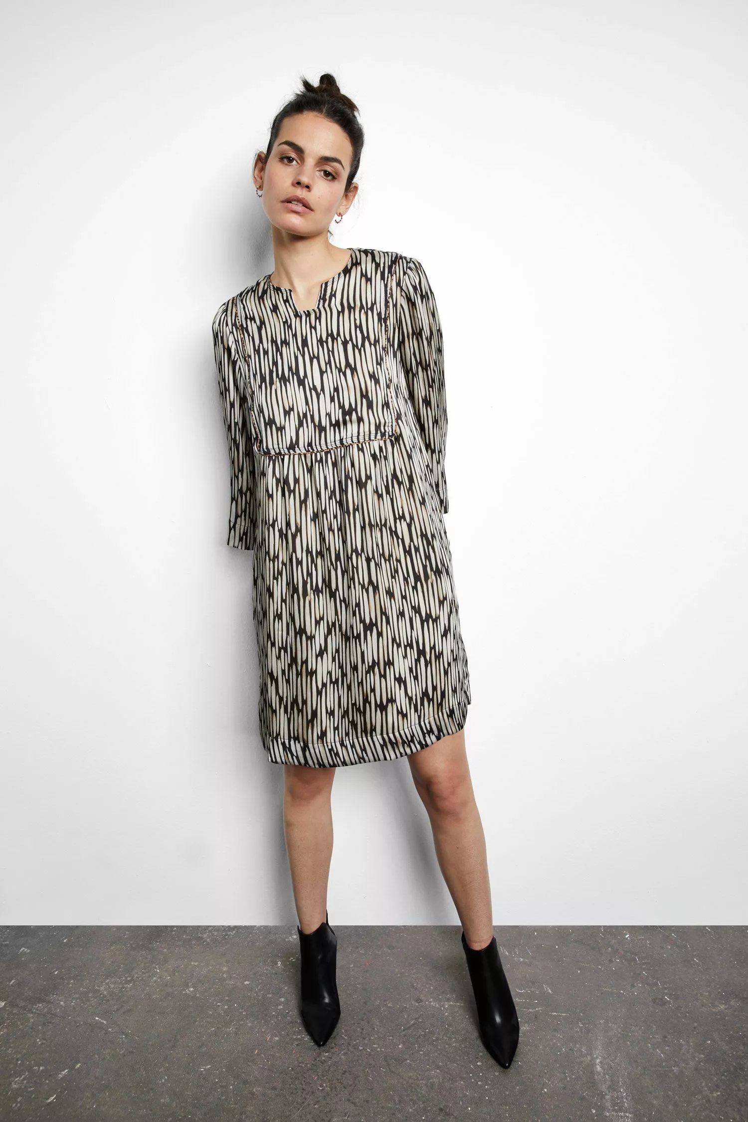 Das figurschmeichelnde CINQUE Kleid mit Taillennaht und leichtem Faltenwurf wirkt lässig und chic zugleich. Der auffällige Statement-Print sowie weite Fledermaus-Ärmel runden den Look ab.