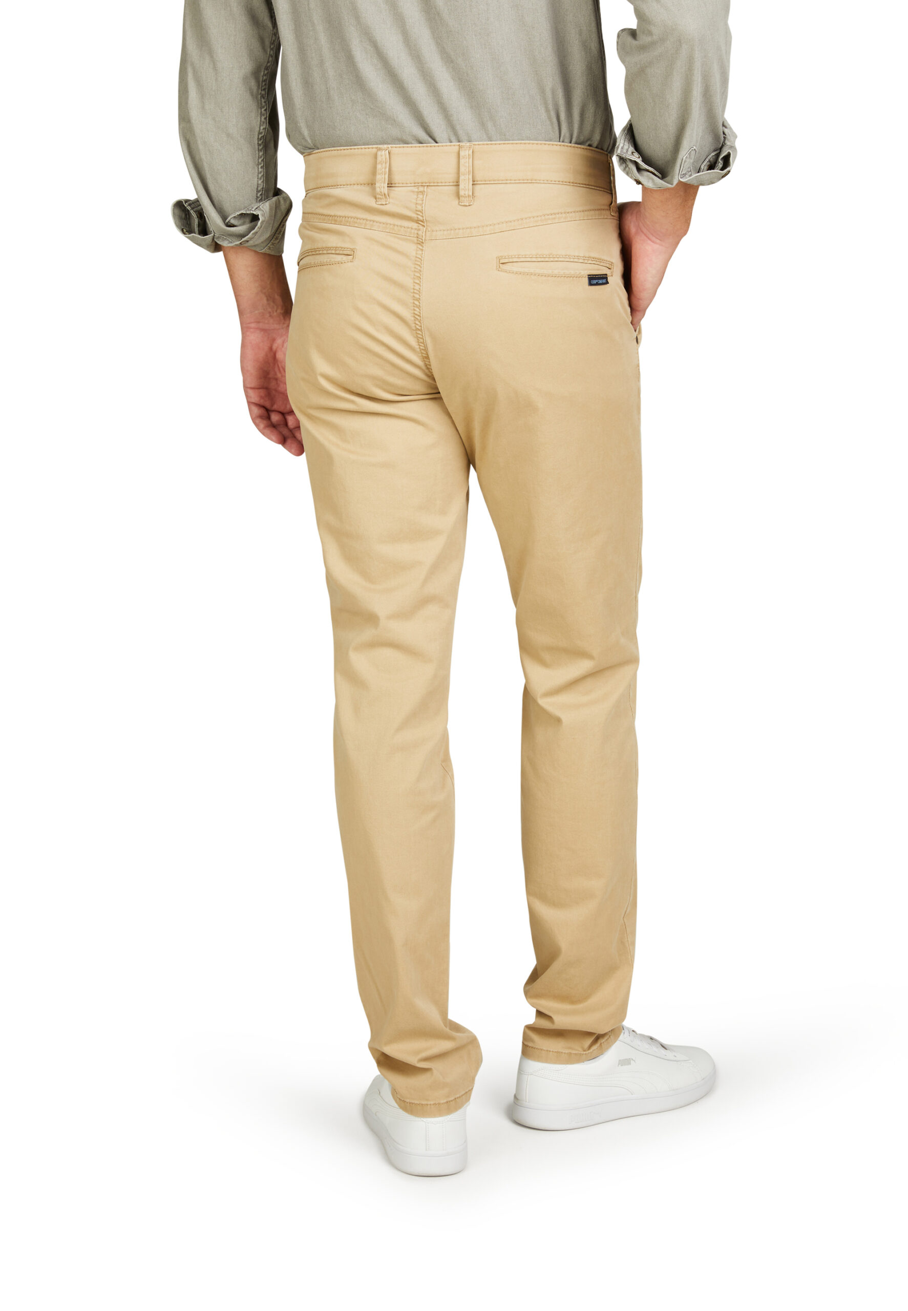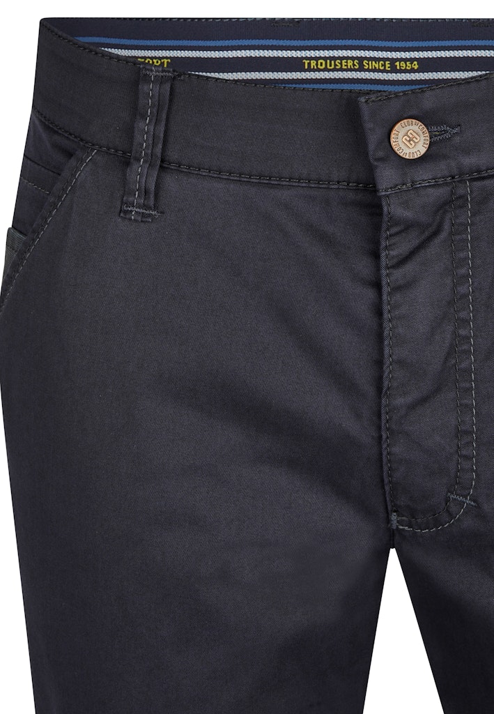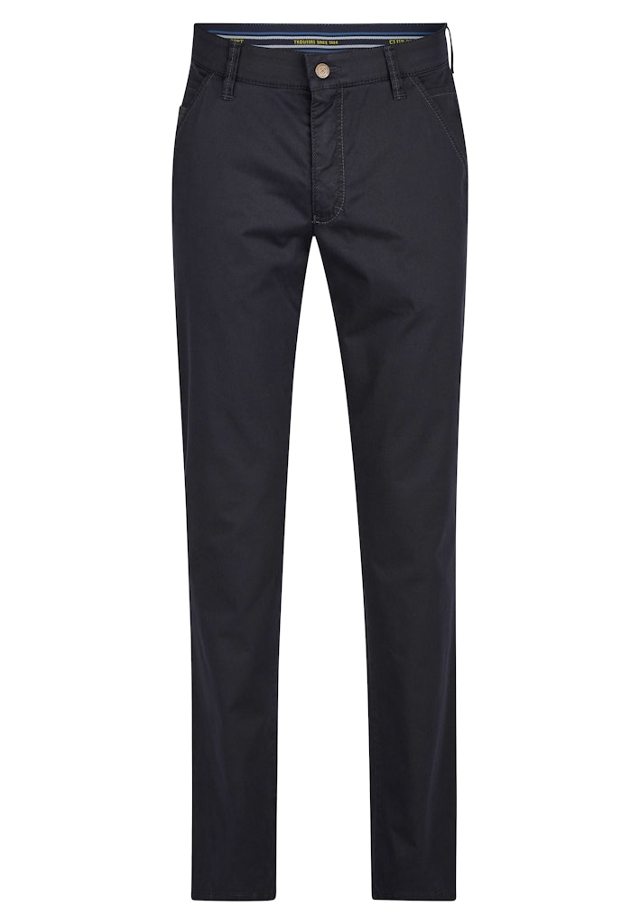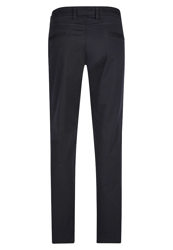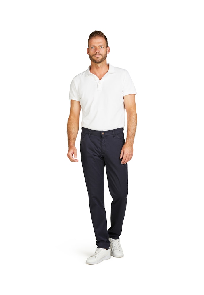 Bequeme Chino in Slim Fit mit elastischem Comfortbund und Hemdstopper. Die Münztasche bringt einen Hauch Sportivität in den Look. Gefertigt aus einem leichten Baumwoll-High Stretch. Die cleane Optik und der softe Griff machen die Hose zu etwas Besonderem. Gewicht: 270 g/lfm Das Modell bietet eine normale Leibhöhe und wegen der deutlich schmaleren Fußweite einen extra schlanken Beinverlauf.