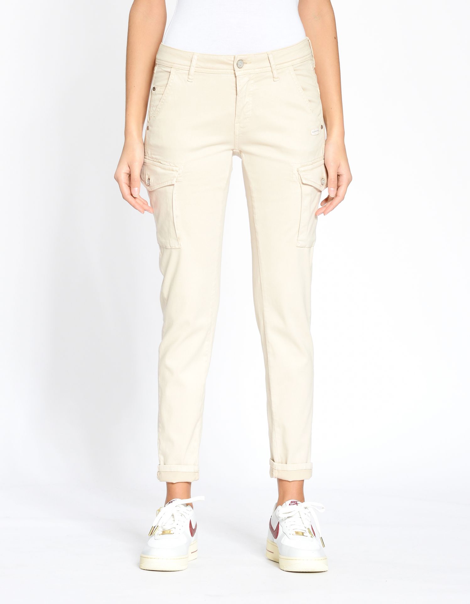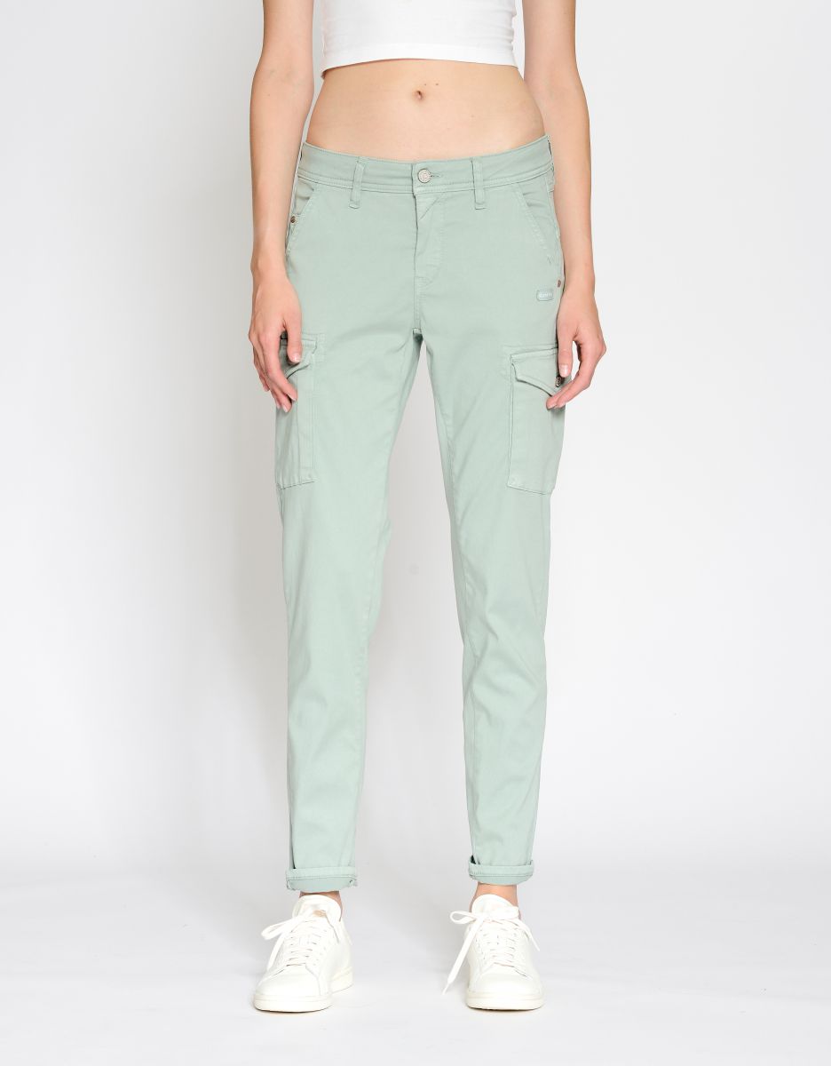 Der GANG Liebling 94AMELIE als Cargo Style. Lässige Cargo Taschen machen den bequemen Relaxed Fit mit verkürzter Beinlänge jetzt noch cooler. Stückgefärbter Baumwoll-Stretch-Satin