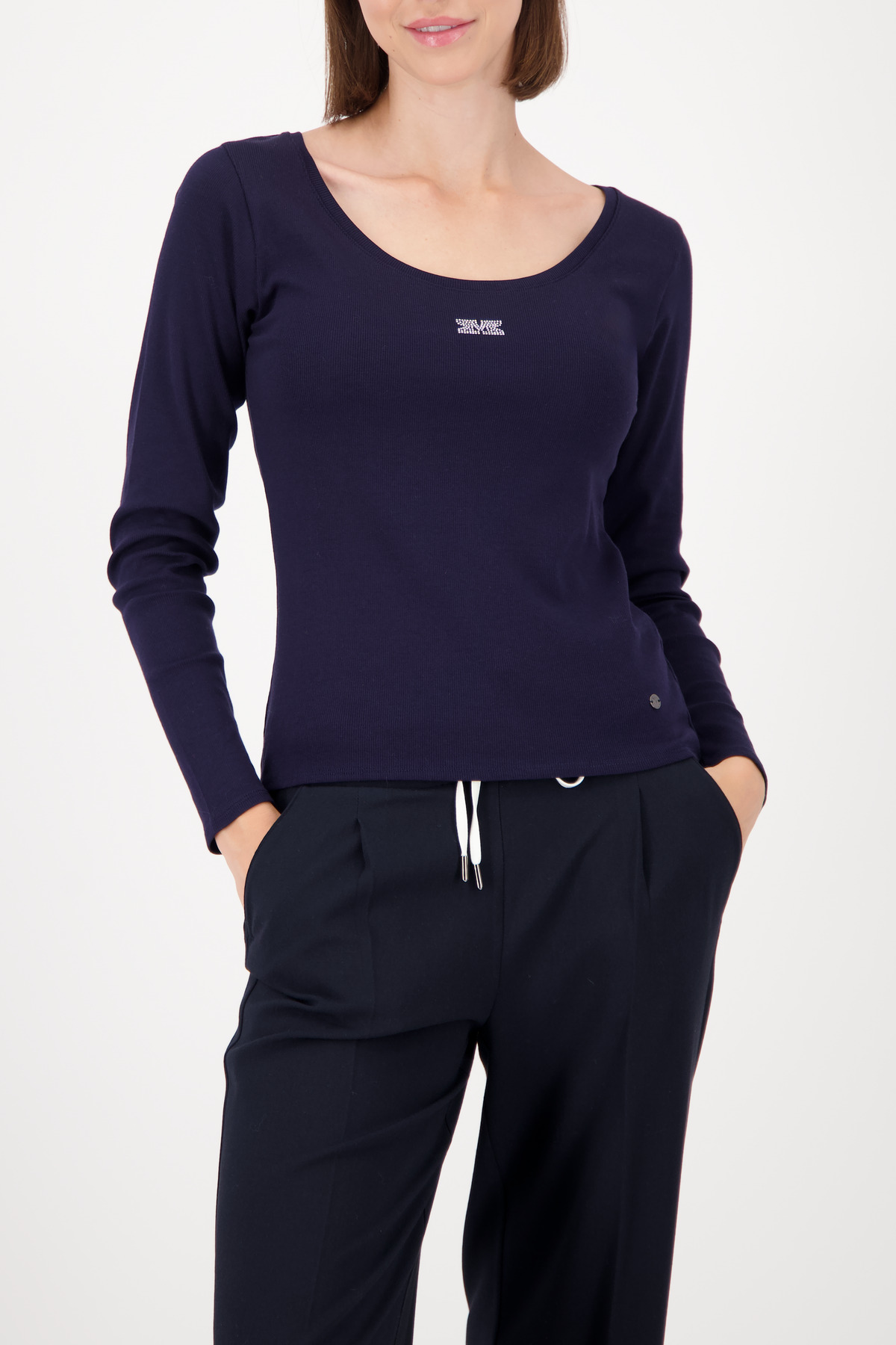 MONARI Damen Langarmshirt dunkelblau, Shirt mit Strasssteinen, Damen Shirt Baumwolle tailliert, MONARI Shirt online kaufen, Modehaus Garrel MONARI
