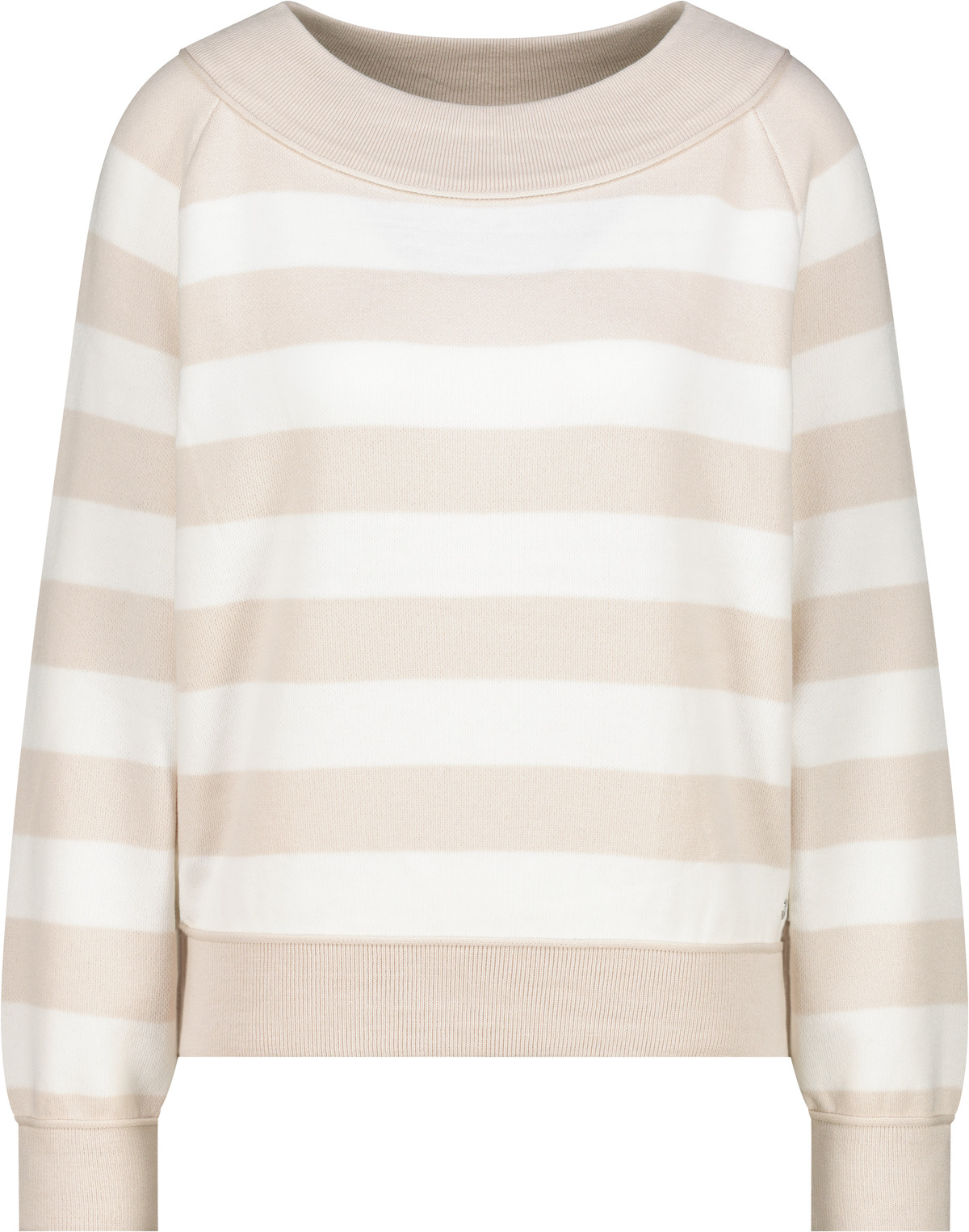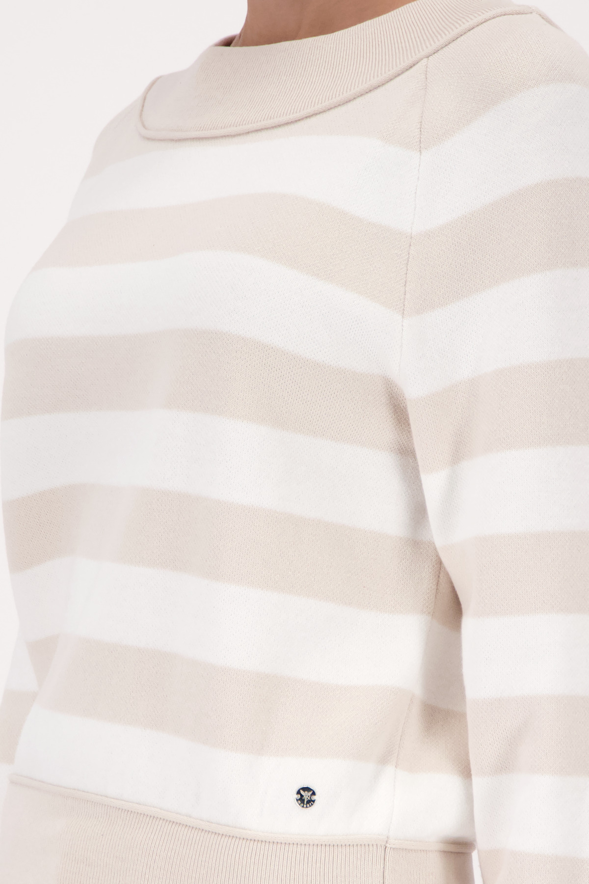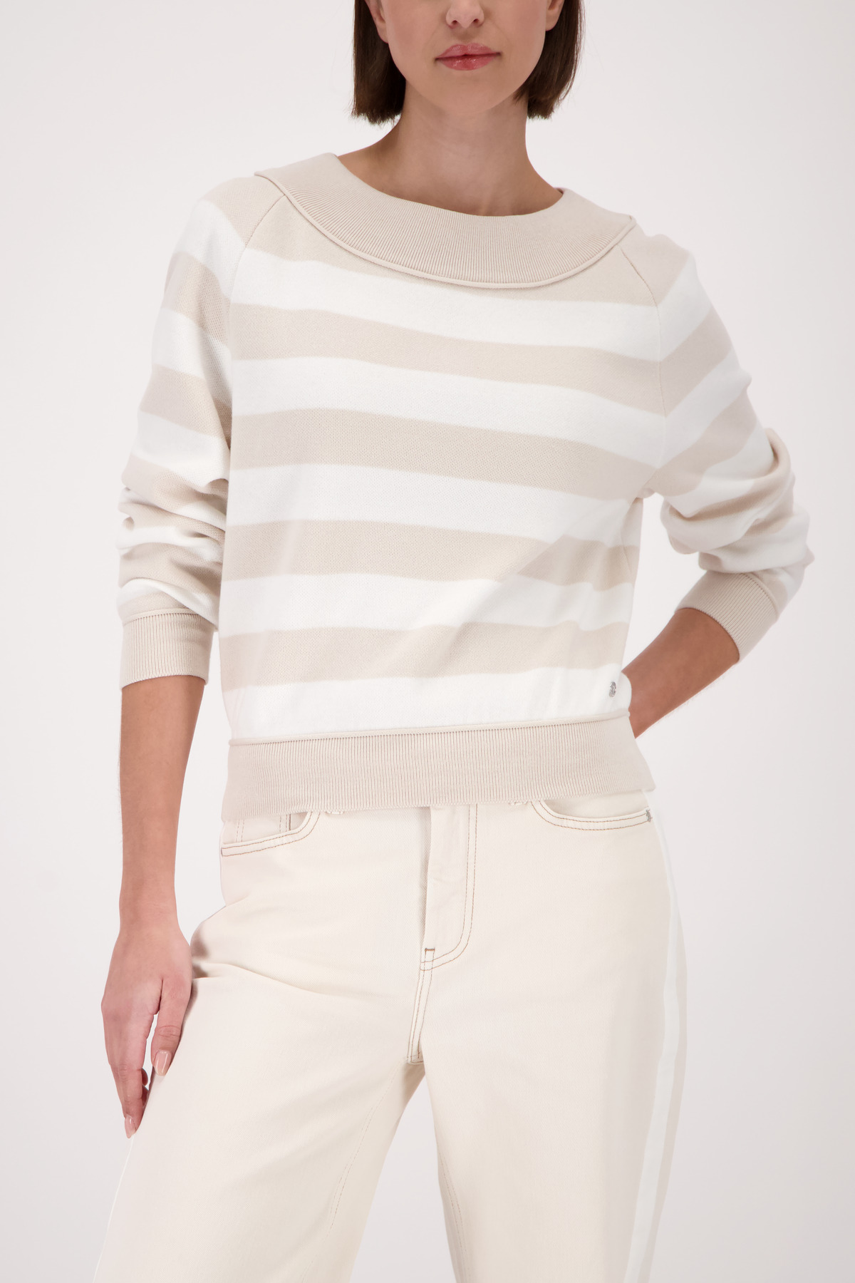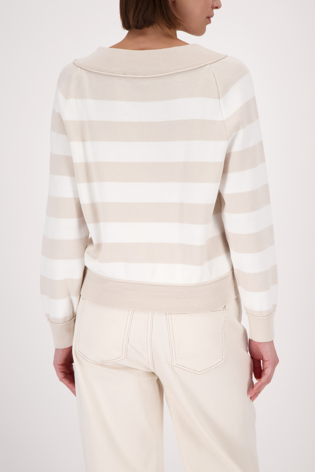 Eleganter Streifen-Strickpullover aus 100% Baumwolle mit U-Boot-Ausschnitt und stilvollem Rollsaumdetail am Saum.