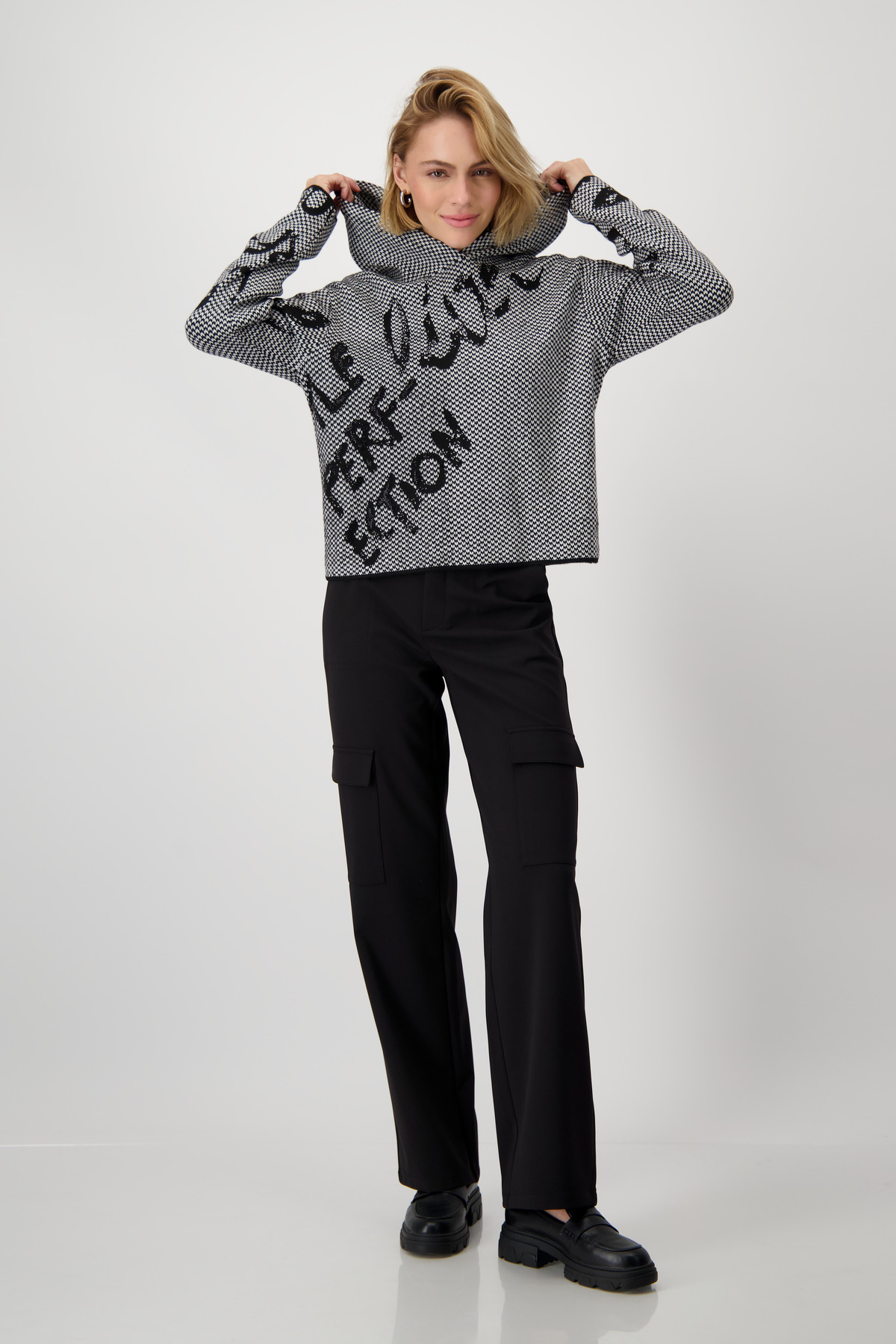 Dieser Strickpullover mit Kapuze besticht durch seine hochwertige Baumwollmischung und den Jacquard-Stoff mit Schriftmuster und funkelnden Strasssteinen.