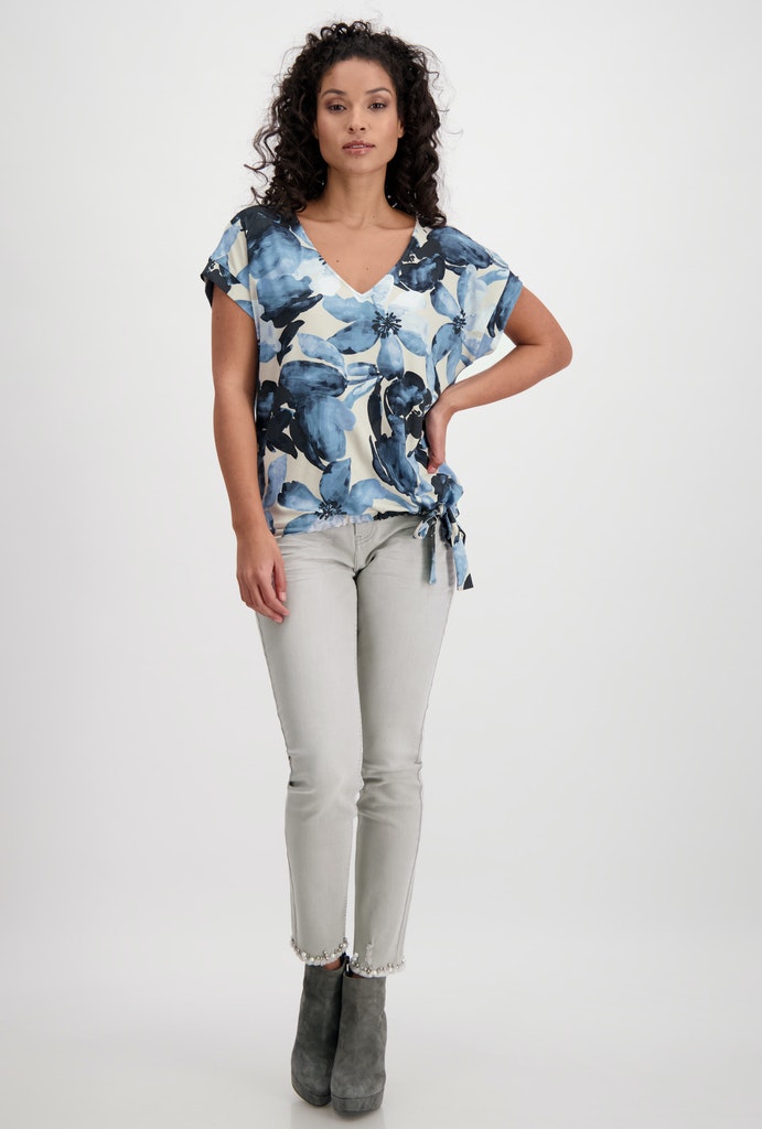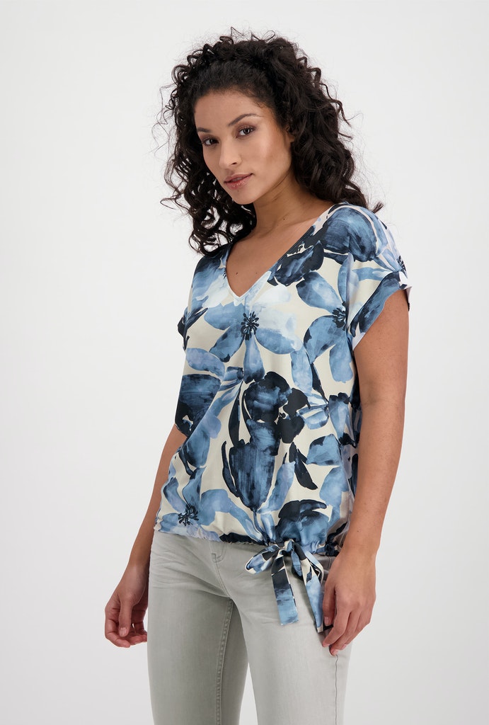 Das besondere Viskose-Shirt von monari ist ein stilvoller Mix aus sportiver gerade geschnittener Form mit angedeutetem, überschnittenem Kurzarm, einem Saum mit Tunnelzug und Bindeband sowie einem femininem Allover-Blumendruck. Die spannende Fusion dieser Elemente ist absolut angesagt und eine coole Abwechslung zum üblichen Basic-Shirt. Lassen Sie sich darauf ein!