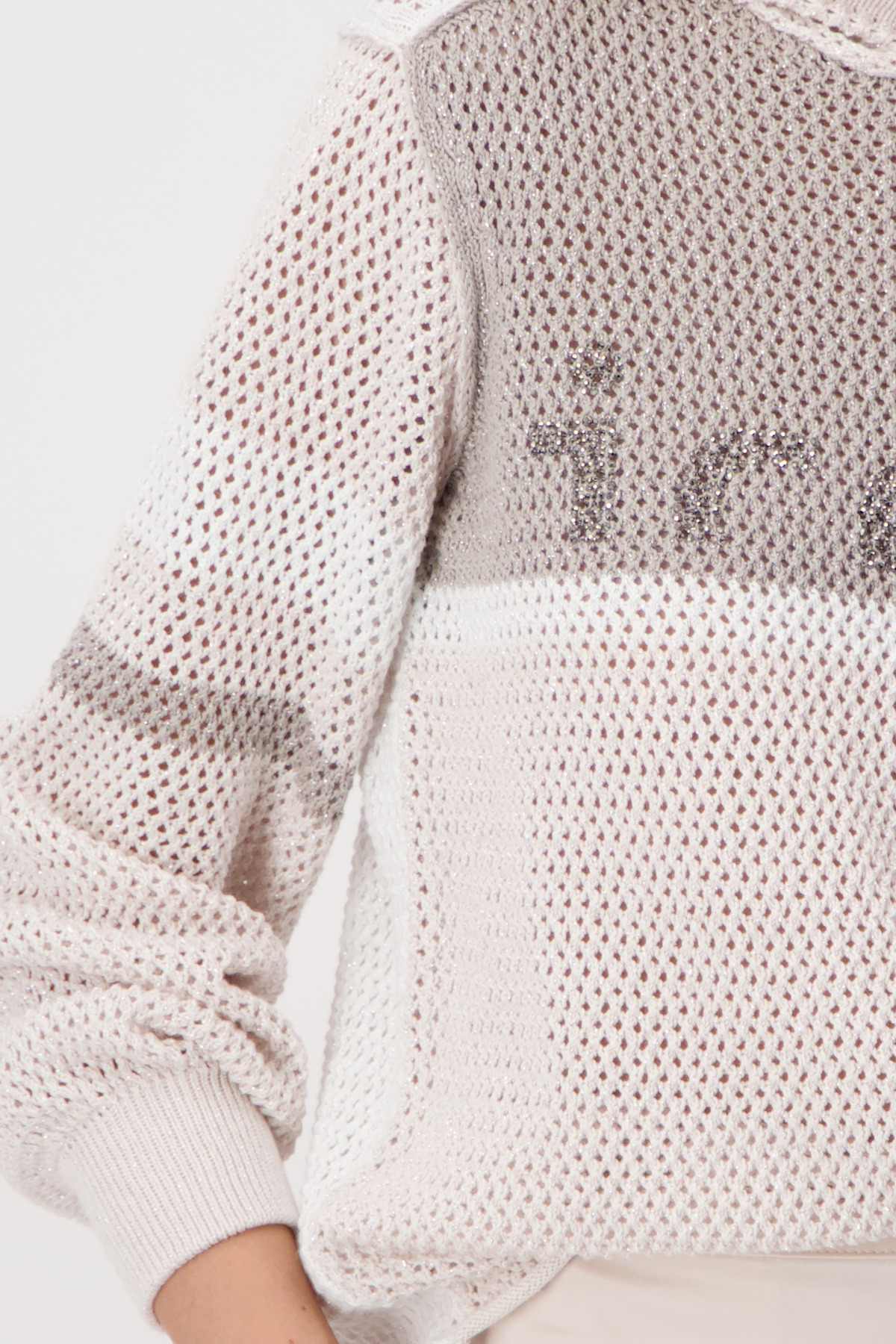Dieser glitzernde Pullover mit Colourblocking und Ajourmuster wird durch eine Strassschrift veredelt.