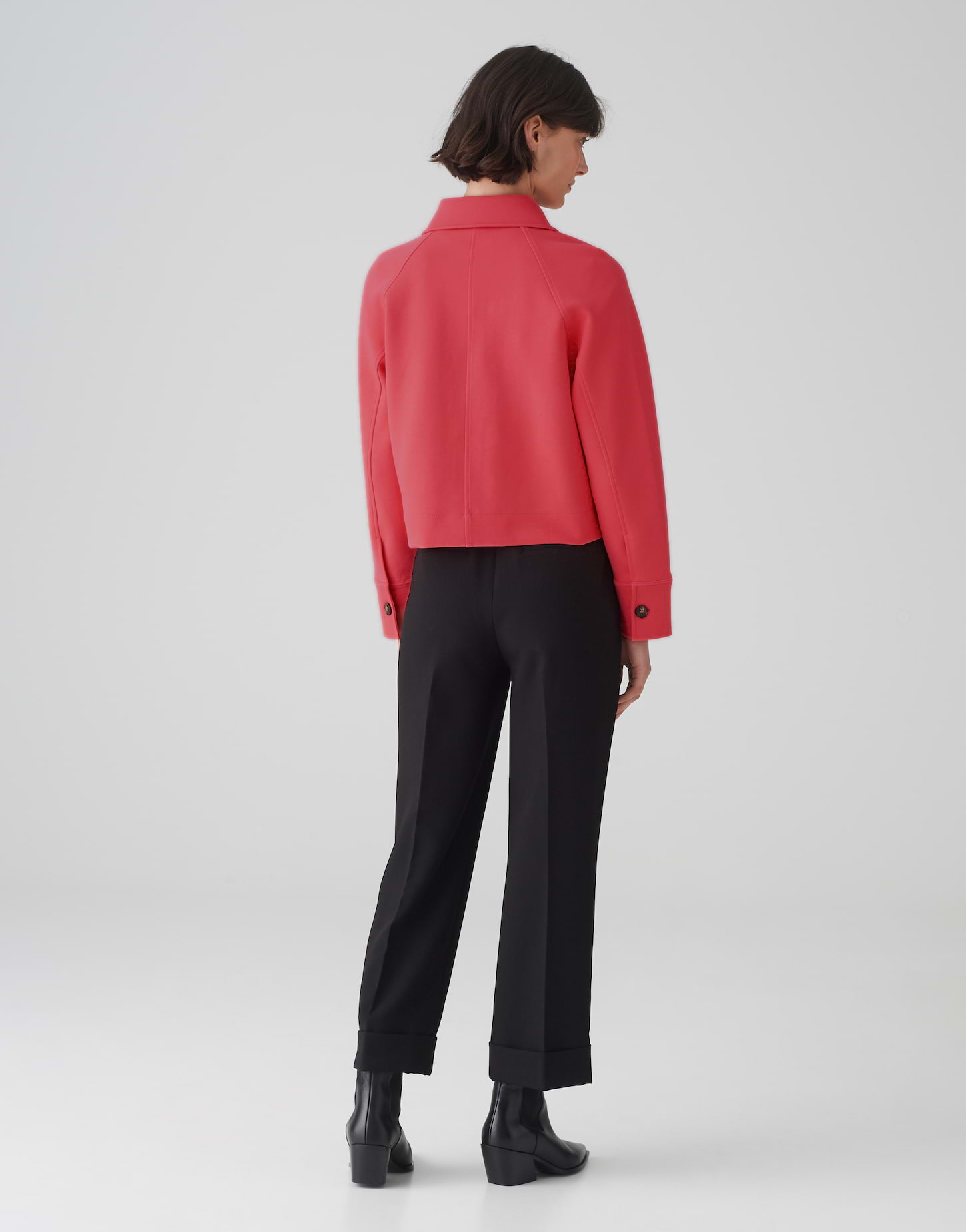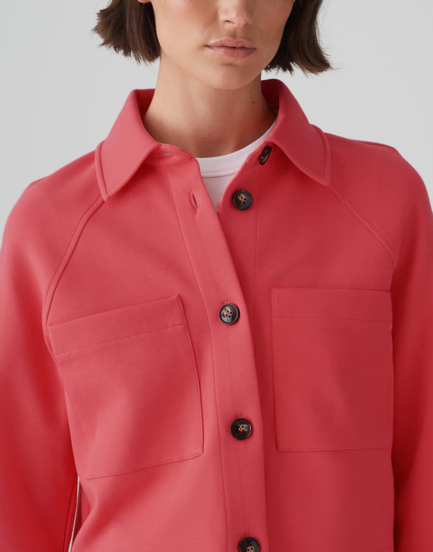 lockere Passform, Boxy Silhouette, verkürzte Länge, Umlegekragen, Langarm, Rückenlänge ca. 52 cm bei Größe 36, Model Größe 178 cm – trägt Größe 36, Sweatware, weicher Griff, formbeständig, Raglanärmel, aufgesetzte Brusttasche, Knöpfe im Marmor-Optik, klassische Manschette, Längsnaht hinten