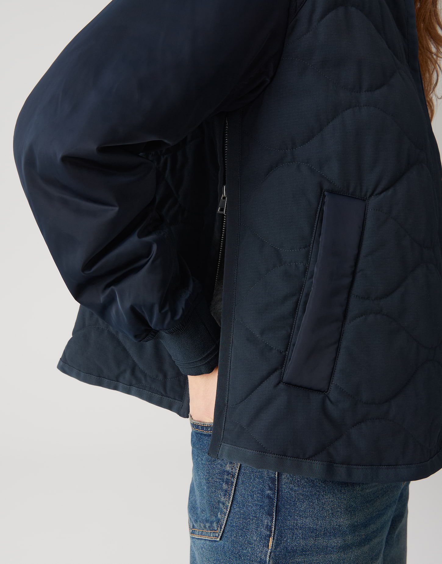 weite Passform, leicht ausgestellt geschnitten, Langarm, Blousonkragen, Rückenlänge ca. 62 cm bei Größe 36, Model Größe 178 cm – trägt Größe 36, Futter: Polyester, glatter Griff, matter Glanz in der Oberfläche, wasserabweisend, windresistent, recycelte Wattierung, Steppmuster, schräge Eingrifftaschen, Kellerfalte im Rücken, Rippbündchen an Ärmelenden und Kragen, verdeckter Reißverschluss, Seitenschlitze mit Reißverschluss, Innentasche