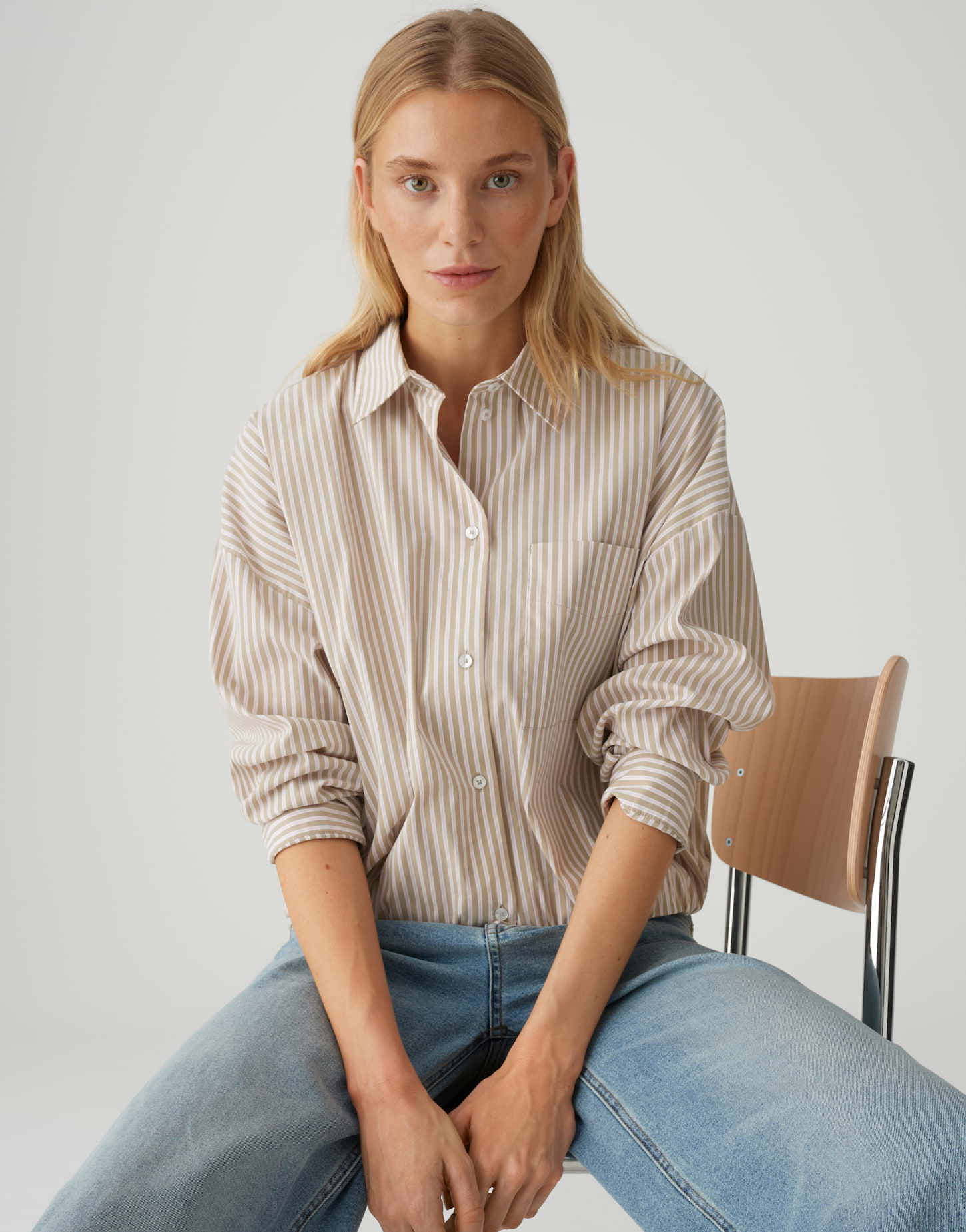 lockere Passform, ovaler Schnitt, überschnittene Schulter mit Langarm, Hemdblusenkragen, Rückenlänge ca. 54,5 cm bei Größe 36, Model Größe 176 cm – trägt Größe 36, Webware, glatter Griff, pflegeleicht, aufgesetzte Brusttasche, geraffter Ballon-Saum, Knopfleiste, Streifenmuster
