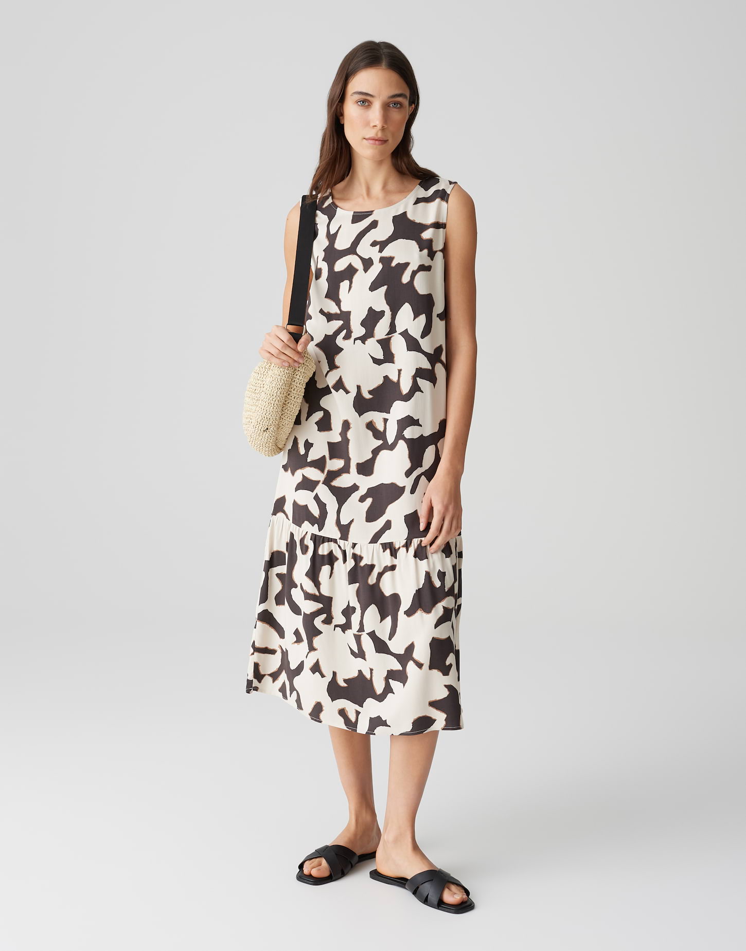 lockere Passform, ausgestellt geschnitten, Midi-Länge, breiter Träger, Rundhalsausschnitt, Rückenlänge ca. 114 cm bei Größe 36, Model Größe 175 cm – trägt Größe 36, enthält nichttextile Teile tierischen Ursprungs, dezente Twillstruktur, glatter Griff, weich fließender Fall, abstrakter Print, Knopf mit Öse im Rücken, Perlmuttknöpfe, Volant mit Kräuselung