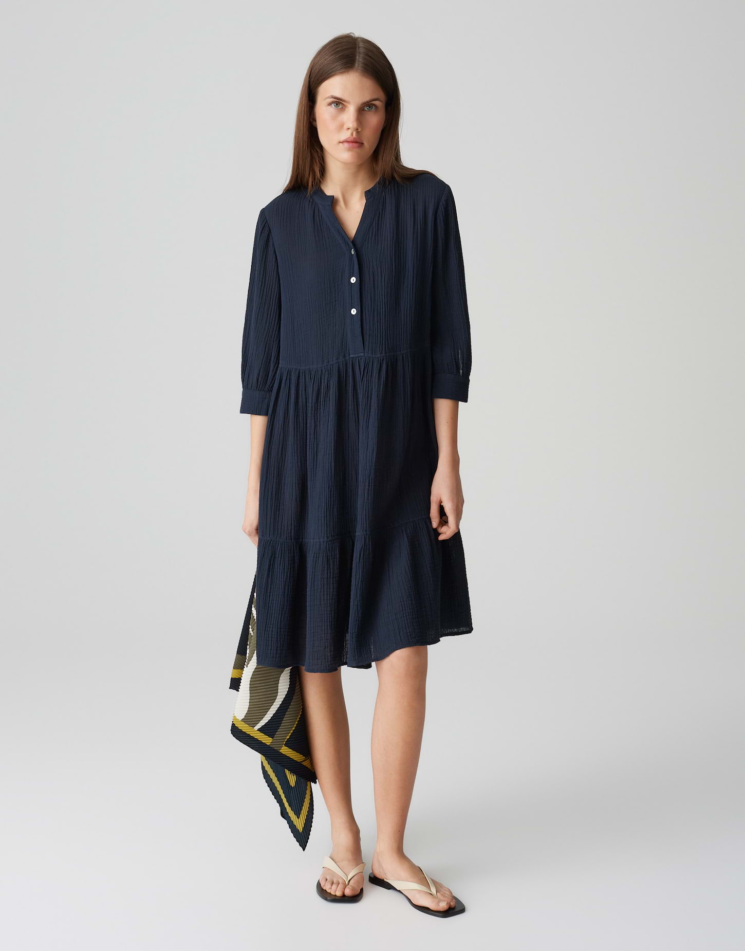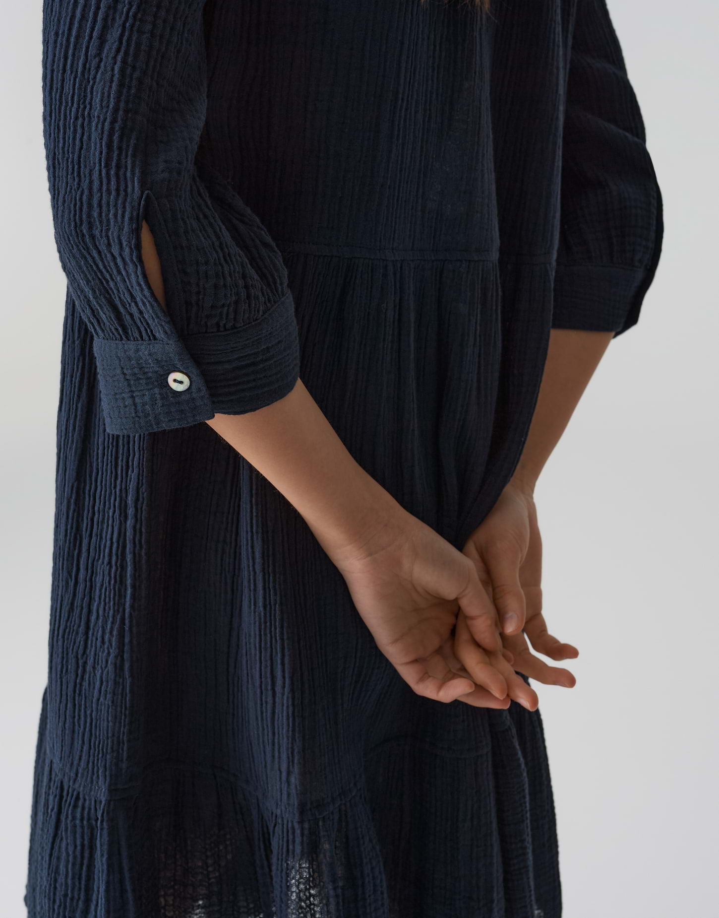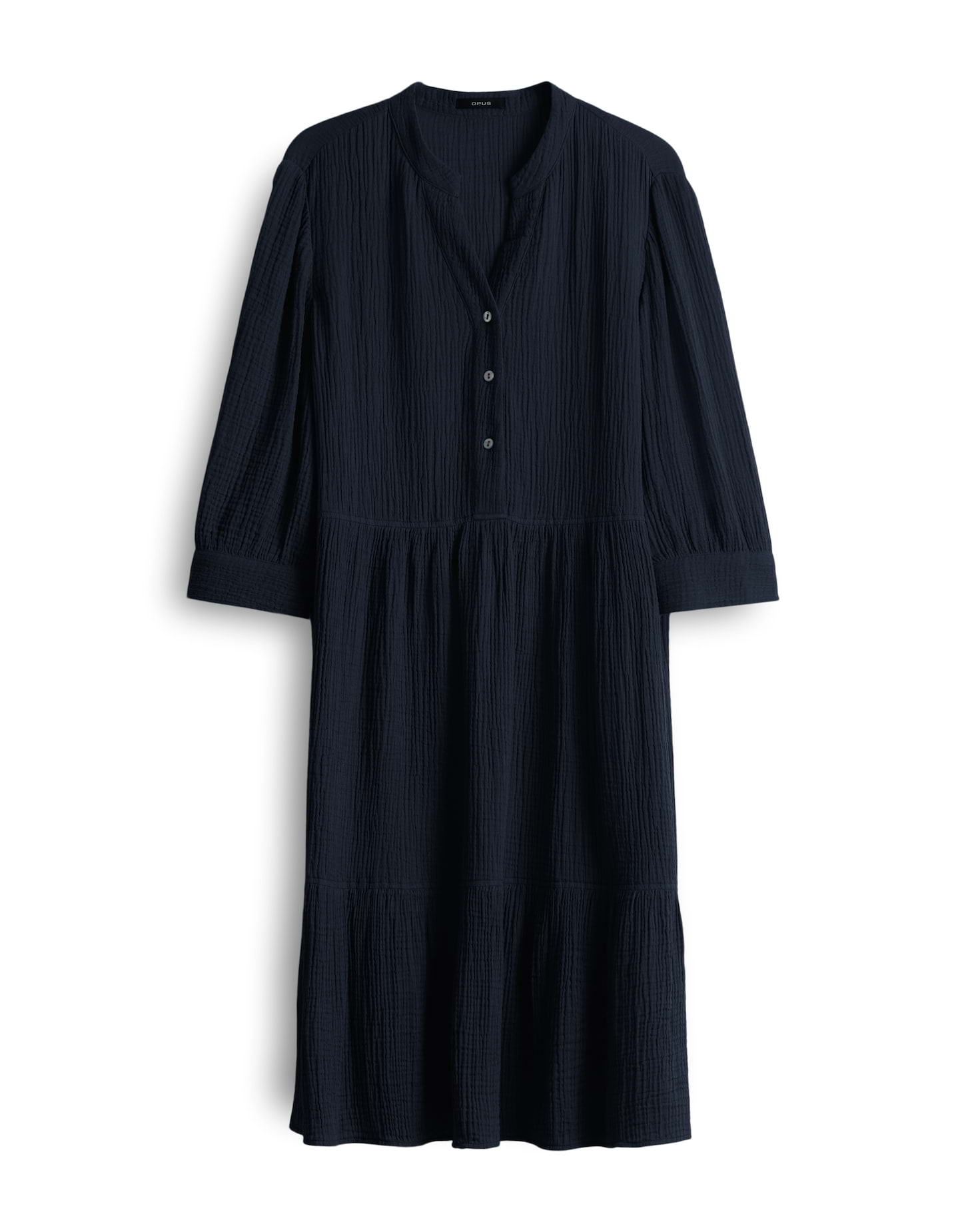 lockere Passform, ausgestellt geschnitten, endet vor dem Knie, 3/4 Arm, Rundhals mit V-Auschnitt, Rückenlänge ca. 100 cm bei Größe 36, Model Größe 175 cm – trägt Größe 36, Webware, enthält nichttextile Teile tierischen Ursprungs, 3-dimensionale Struktur, weicher Griff, weich fließender Fall, kurze Knopfleiste, Perlmuttknöpfe, Ballonärmel, Volant mit Kräuselung