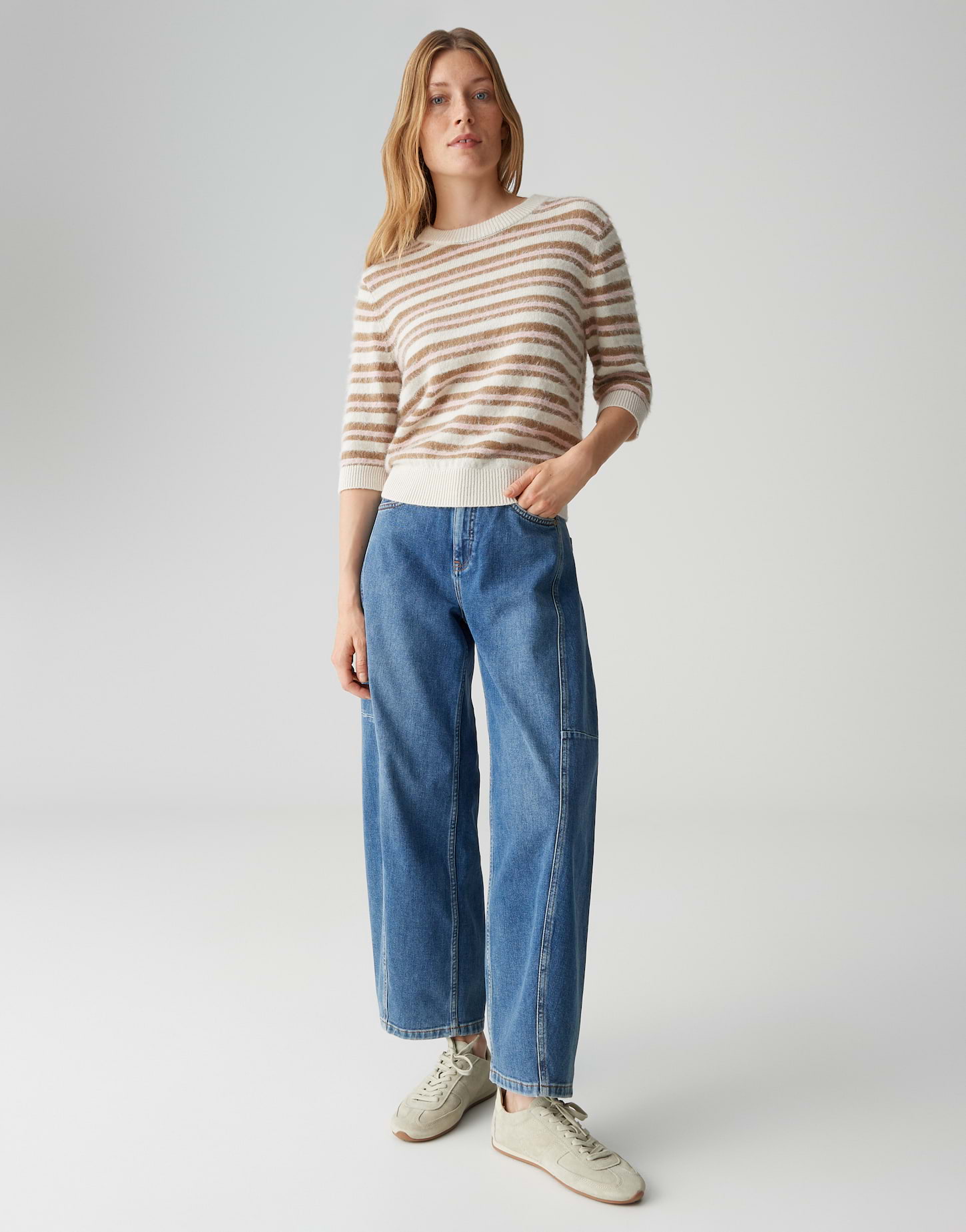 schmale Passform, schmal zulaufend, verkürzte Länge, 3/4 Arm, Rundhalsausschnitt, Rückenlänge ca. 54 cm bei Größe 36, Farbe soft ink: Model Größe 174 cm – trägt Größe 36, Farbe coral blush: Model Größe 180 cm – trägt Größe 36, Strick, weicher Griff, flauschige Oberfläche, mehrfarbige Streifen, Strickbündchen