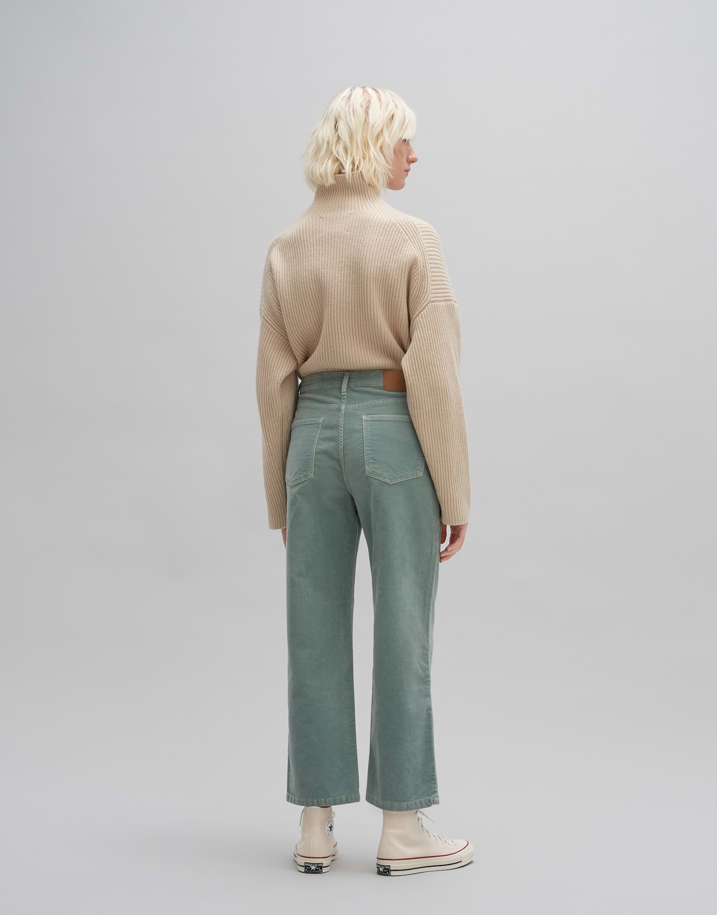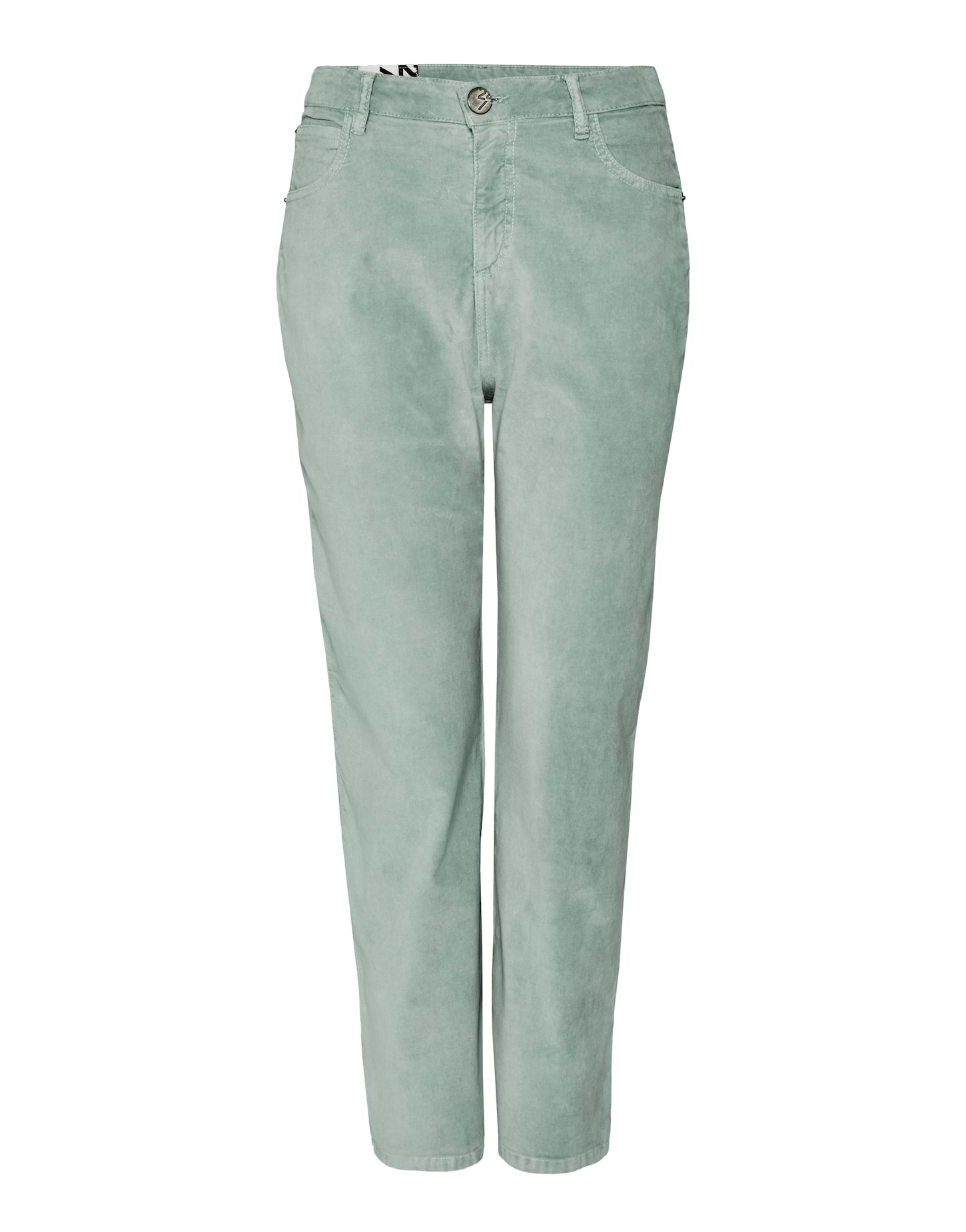 Baumwoll-Mix, samtartige Oberfläche, verkürztes, weites Bein, 5-Pocket-Design, das Model ist 176 cm groß und trägt Größe 36, Beininnenlänge ca. 68 cm