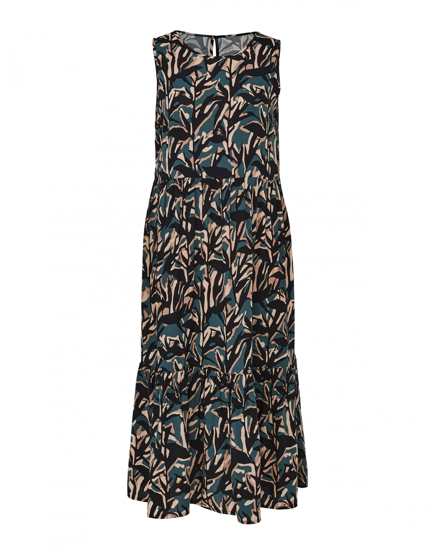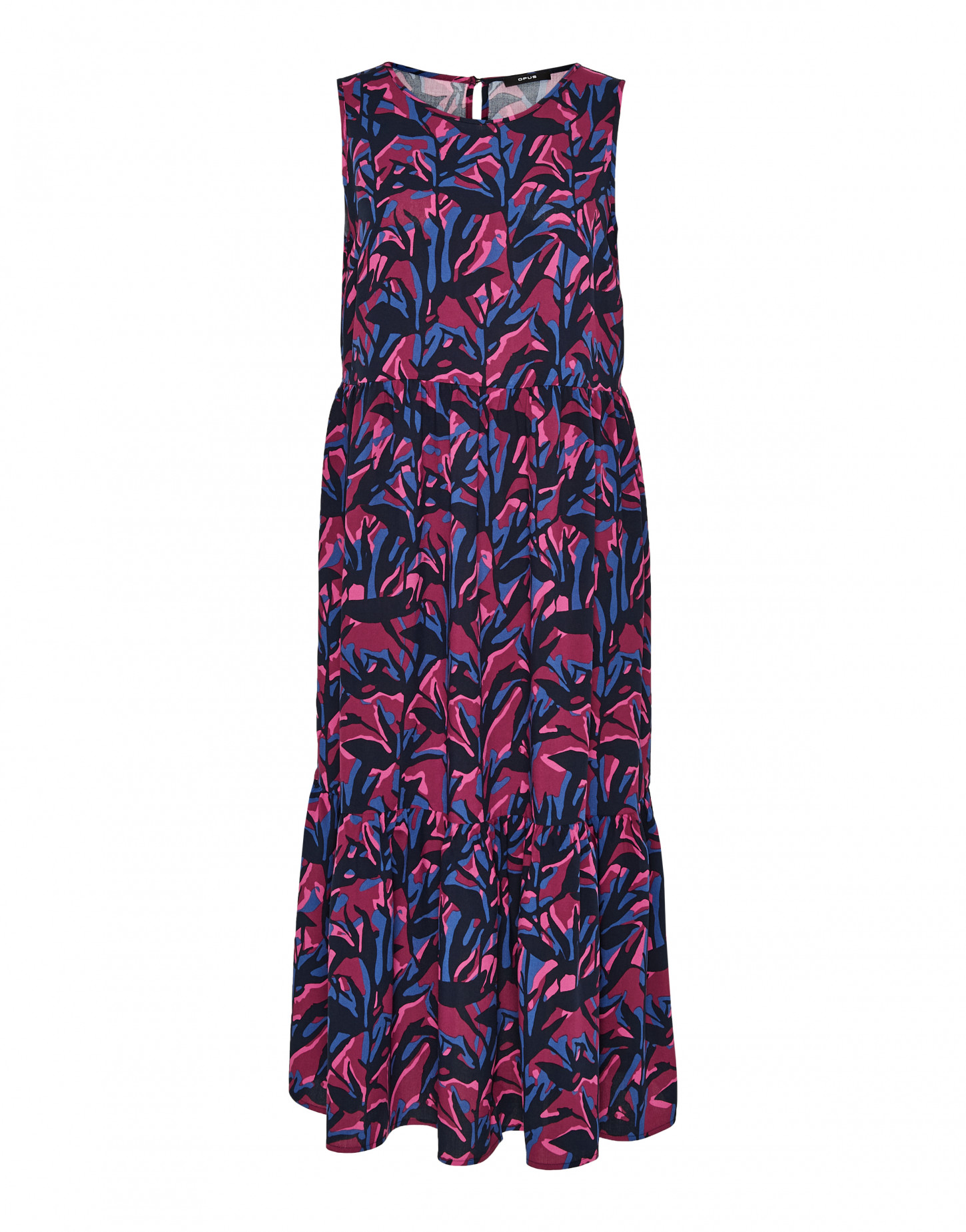 ECOVERO™ Viskose, floraler All-Over-Print, Schlitz mit Knopf im Rücken, Länge reicht bis über das Knie hinaus, Breite Volants, A-Linie, Nullarm, das Model ist 176 cm groß und trägt Größe 36, Rückenlänge ca. 116 cm bei Gr. 36