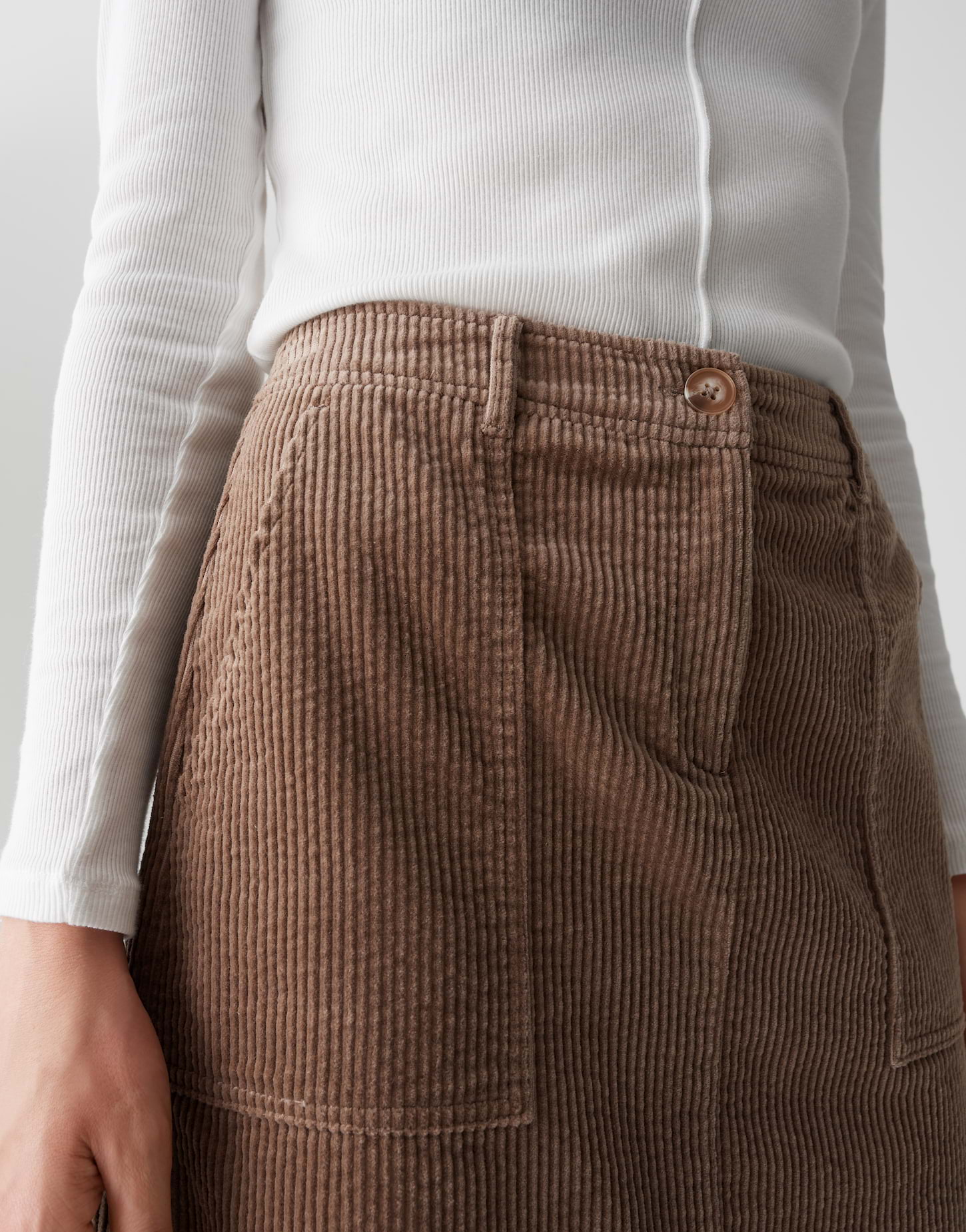 normale Passform, leicht ausgestellter Schnitt, Mini-Länge, hintere Länge ca. 48 cm in Größe 36, Model Größe 174 cm – trägt Größe 36, Cord, ungefüttert, Rippstruktur, weicher Griff, samtige Oberfläche, verdeckter Zip-Fly, eckig abgesteppte Taschen, aufgesetzte Taschen hinten