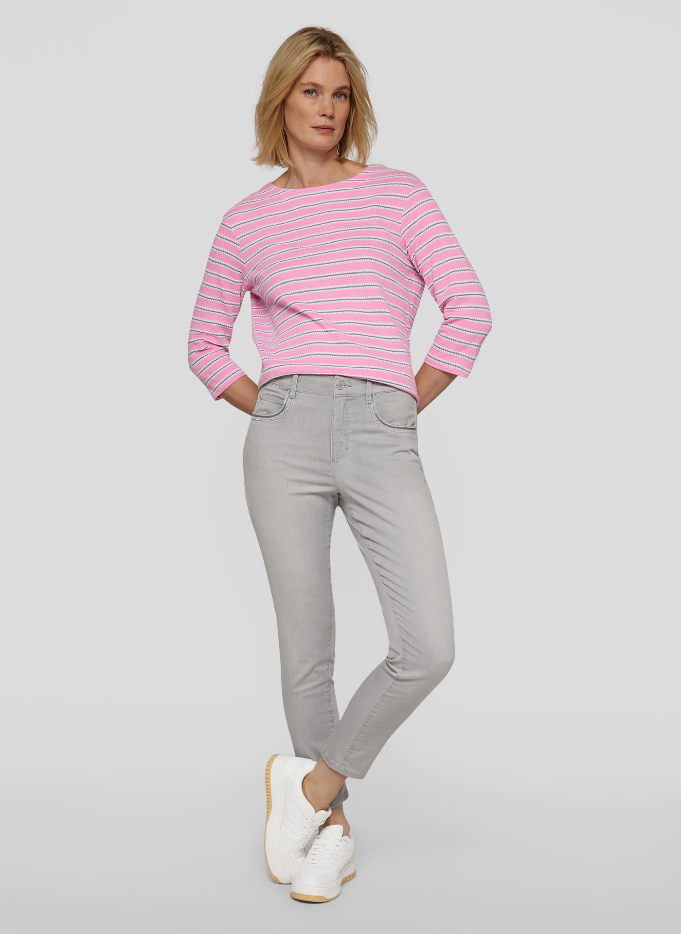 Dieses Shirt begeistert mit einer fein strukturierten Oberfläche und klassischen Ringeln. Der angenehme Materialmix sorgt für ein weiches Tragegefühl, Formstabilität und eine schöne Leichtigkeit. Der 3/4-Arm und der schlichte Rundhalsausschnitt unterstreichen den zeitlosen Charakter. Ein vielseitiger Begleiter für gepflegte Casual-Looks. Strukturierte Oberfläche. Klassisches Ringeldesign. 3/4-Ärmel. Rundhalsausschnitt. Angenehmer Materialmix.