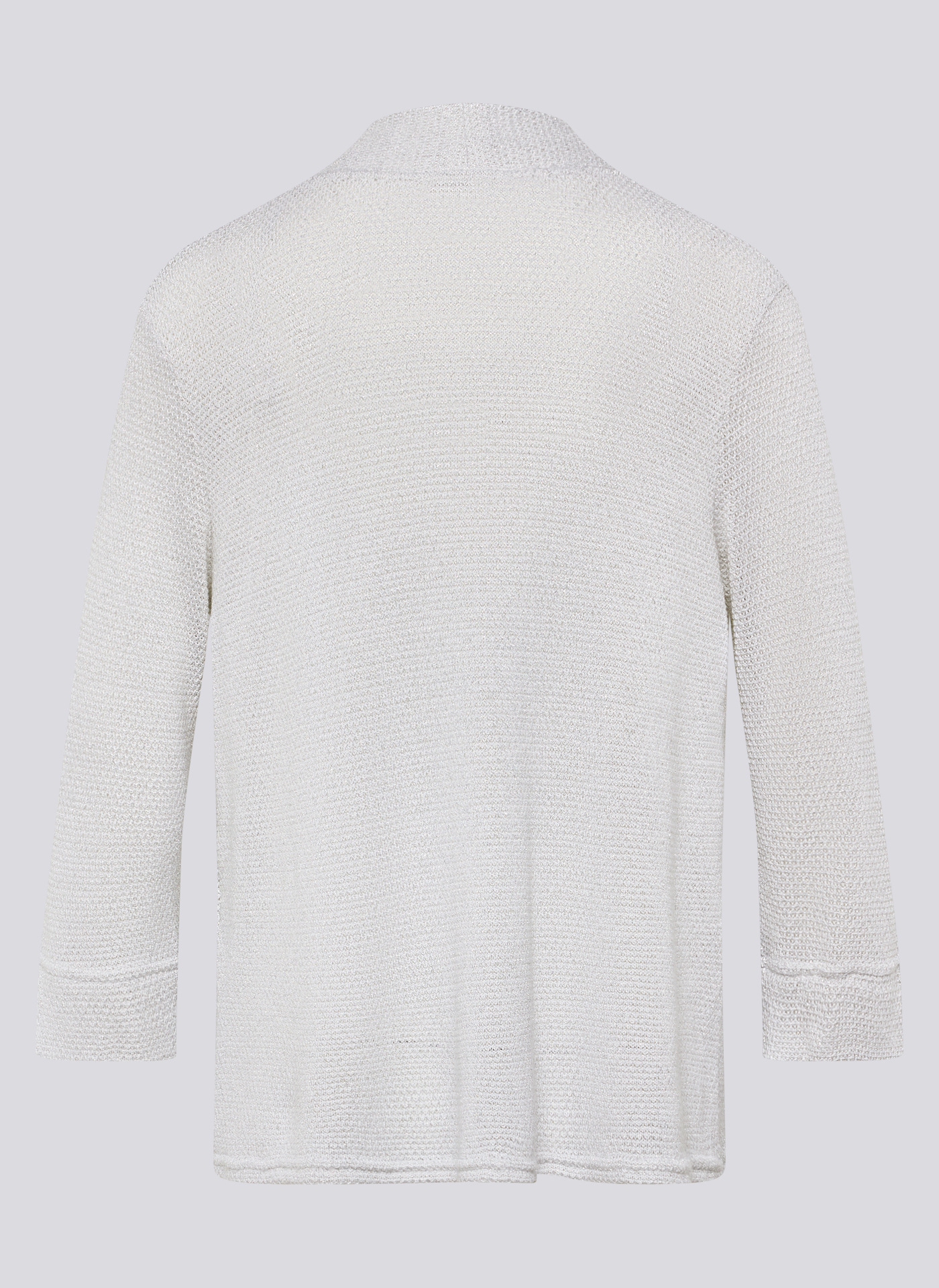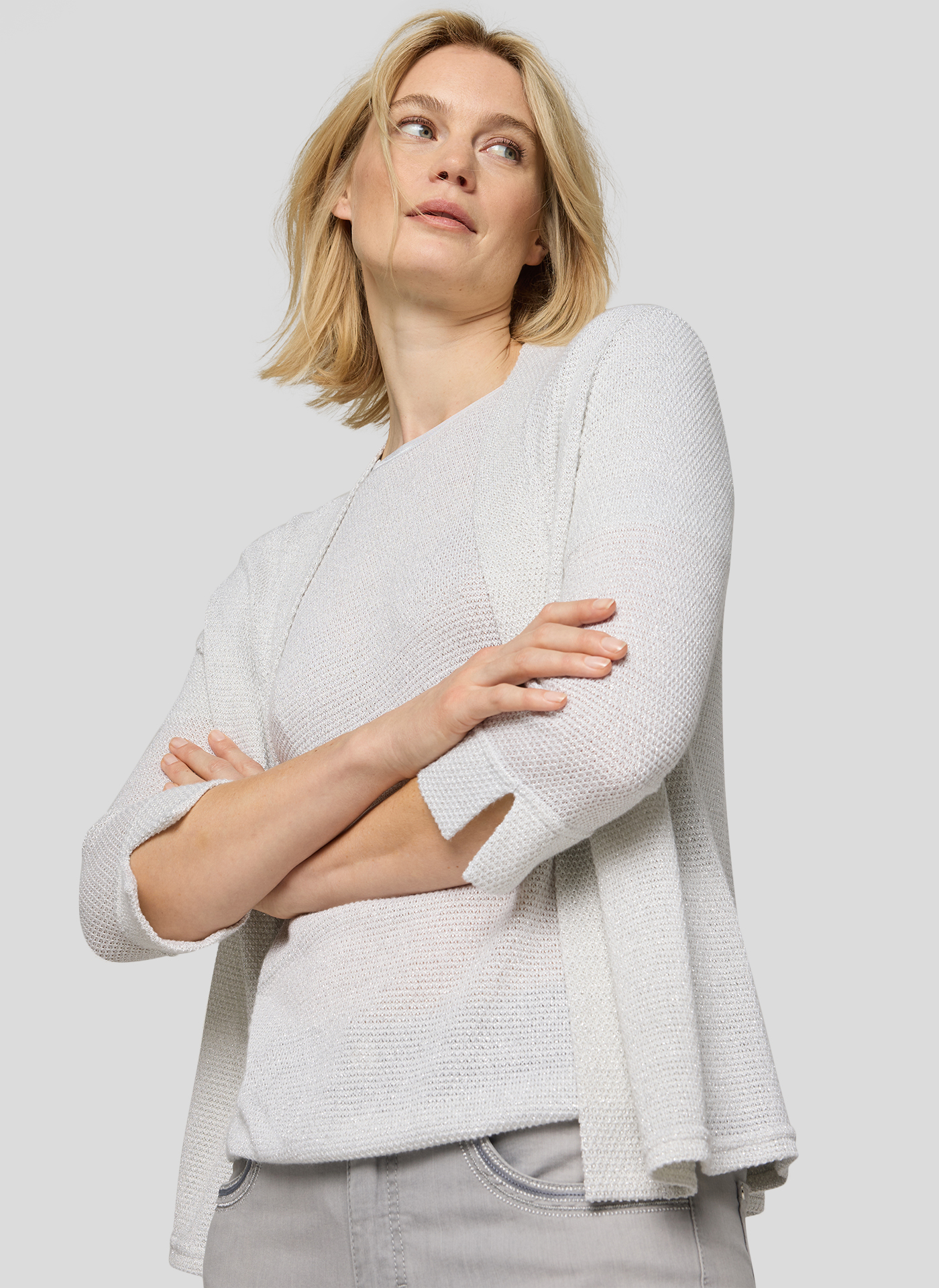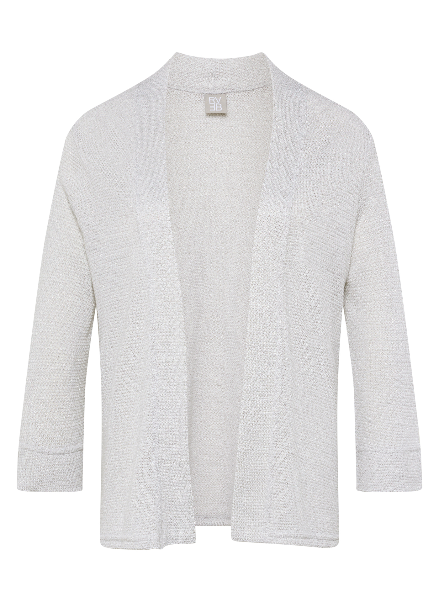 Dieser Cardigan überzeugt durch seine besondere Materialkomposition aus 87 % Viskose und 13 % Maguey. Die Viskose sorgt für ein angenehm weiches, fließendes Tragegefühl, während die Maguey-Faser dem Strick eine natürliche Struktur und dezente Standfestigkeit verleiht. Die offene Form ohne Verschluss, die 3/4-Ärmel mit kleinem Schlitz sowie die feine Strickoptik machen ihn zum vielseitigen Begleiter für leichte Layering-Looks. Luftige, strukturierte Qualität. Offene, verschlusslose Form. 3/4-Arm mit Schlitz. Angenehm weich im Griff.