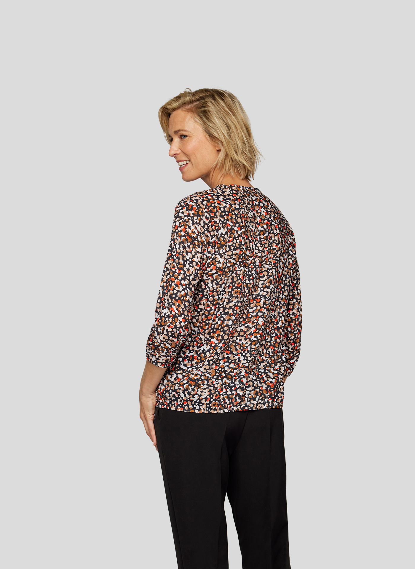 Erleben Sie stilvolle Leichtigkeit mit dieser eleganten Bluse in einem modernen Print-Design. Perfekt für den Alltag und besondere Anlässe! Farbenfrohes, abstraktes Design in warmen Tönen, das jedes Outfit aufwertet. Lockere Passform, die Komfort mit Stil verbindet. Eleganter V-Ausschnitt mit dezenter Knopfleiste für eine feminine Note.