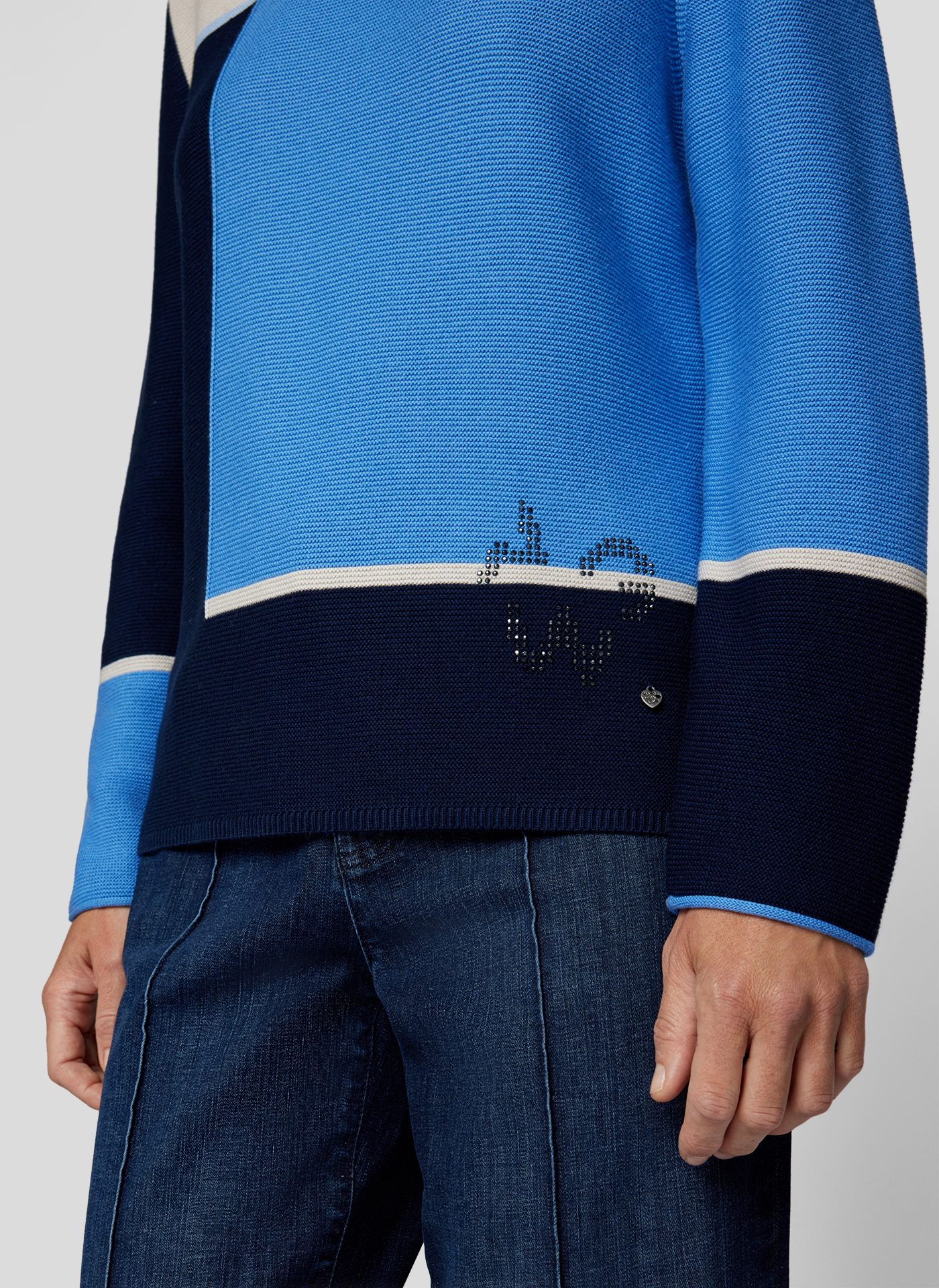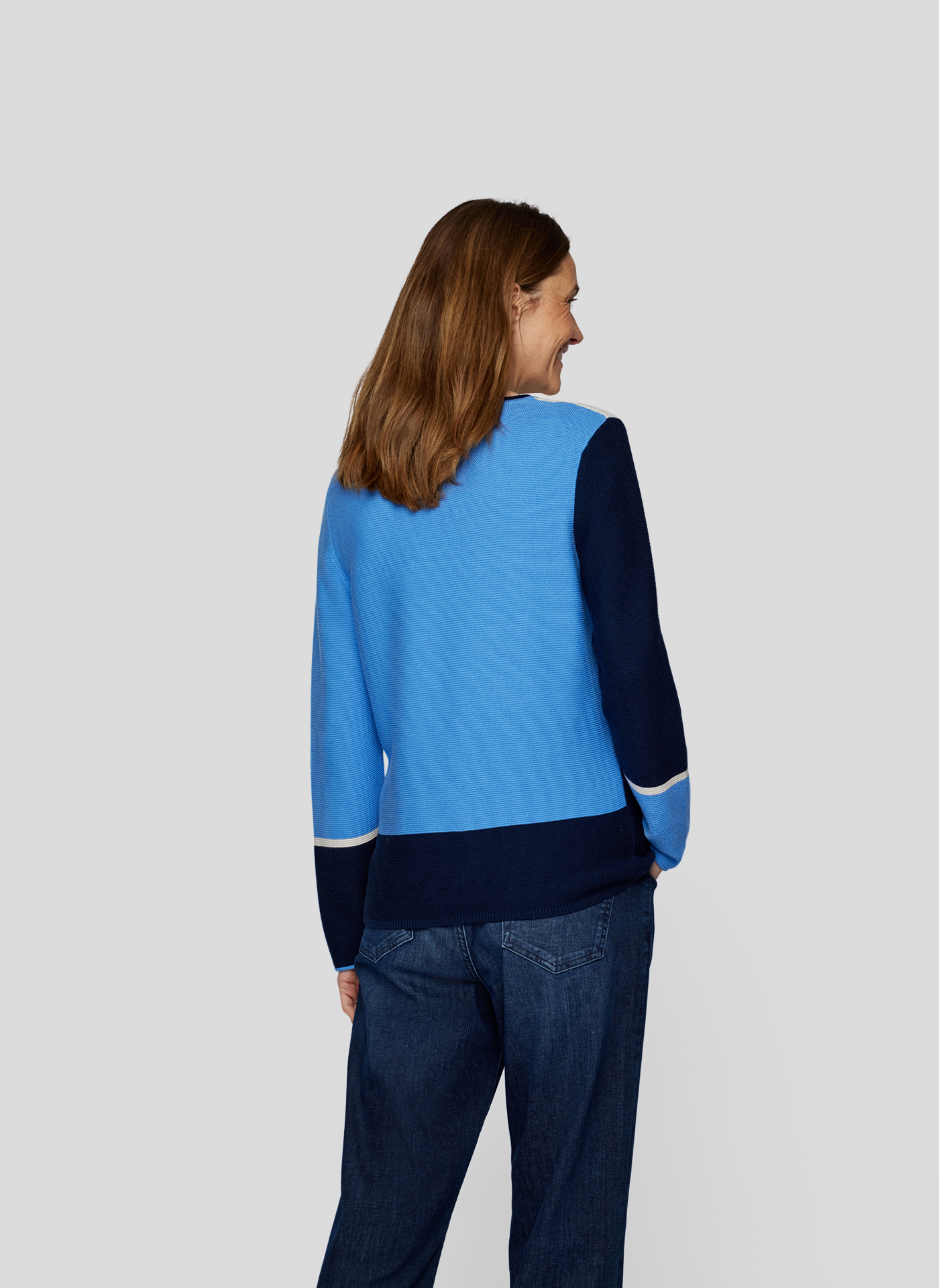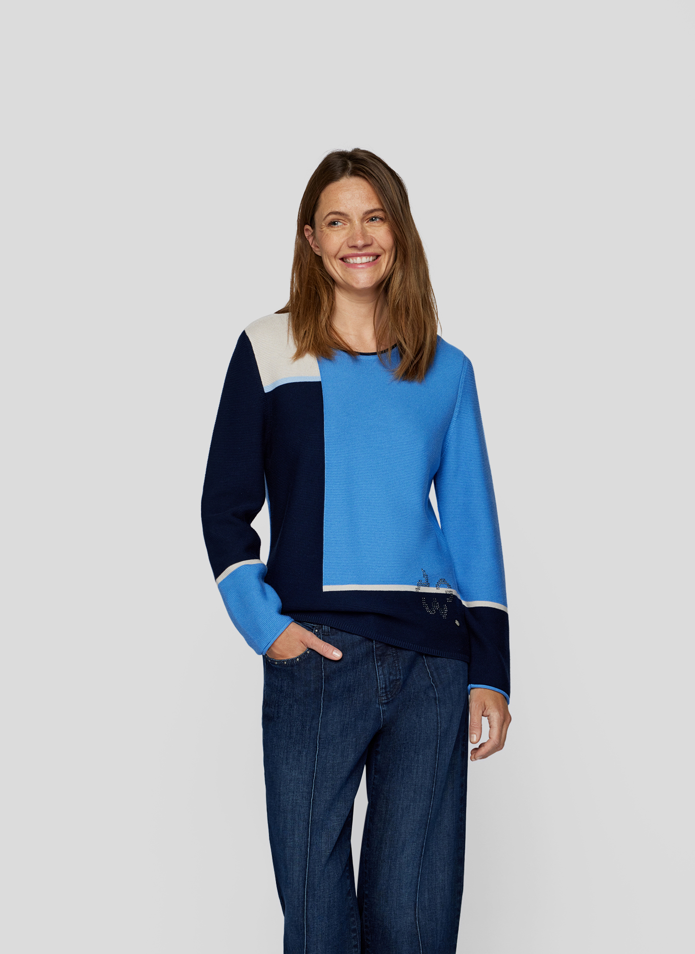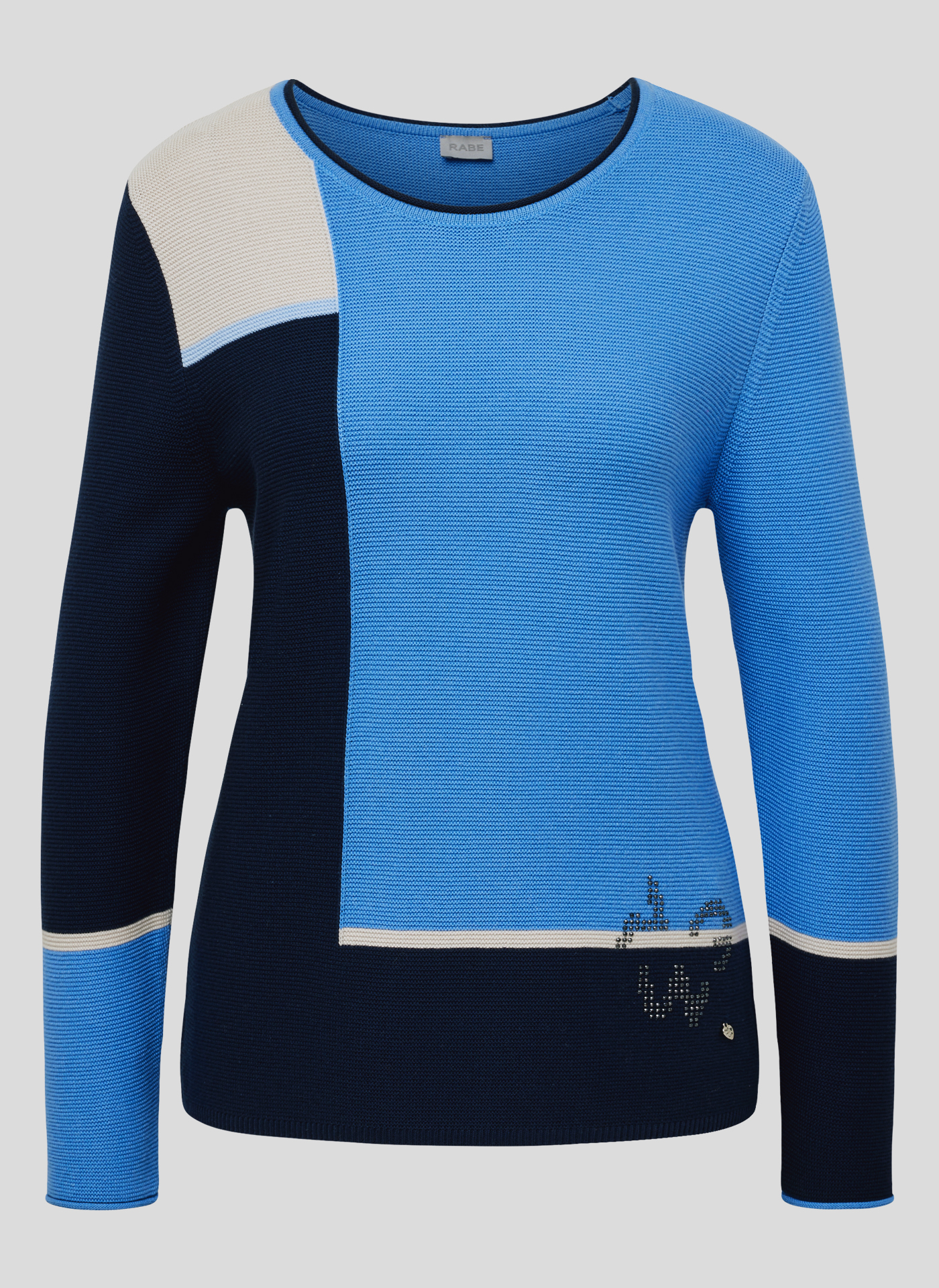 Dieser elegante Pullover vereint Komfort und Stil in einem einzigartigen Design. Aus 50% Baumwolle und 50% Polyacryl gefertigt, bietet er ein angenehmes Tragegefühl und optimale Wärme. Mit seinem Rundhalsausschnitt und den langärmeligen Details ist er ideal für kühlere Tage. Die taillierte Schnittführung betont die feminine Silhouette, während die großformatigen Farbblöcke dem Look einen modernen Akzent verleihen.