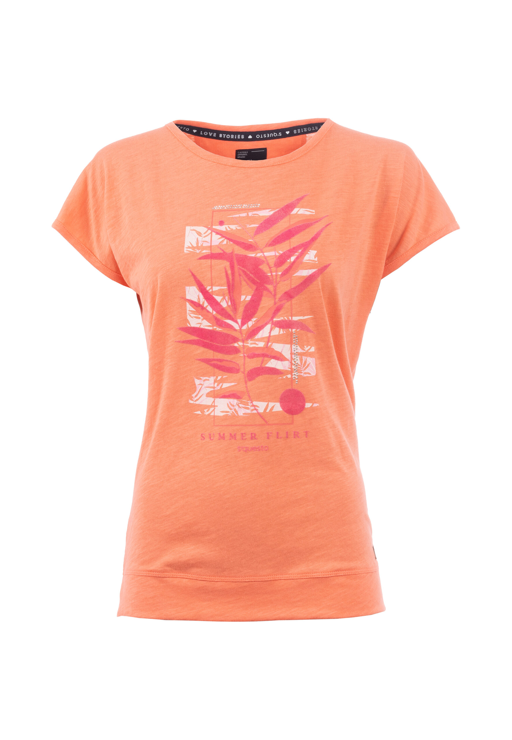 Flame Yarn-Shirt mit überschnittenen Schultern und Rundhalsausschnitt. Ein botanisches Print-Motiv mit Flock und schimmernden Metallplättchen machen den Look zum sommerlichen Eyecatcher. Mit kleinen Schlitzen am Saum.