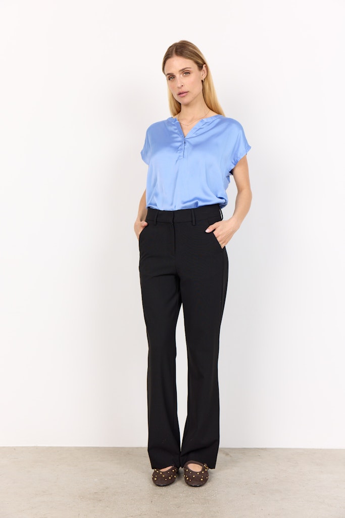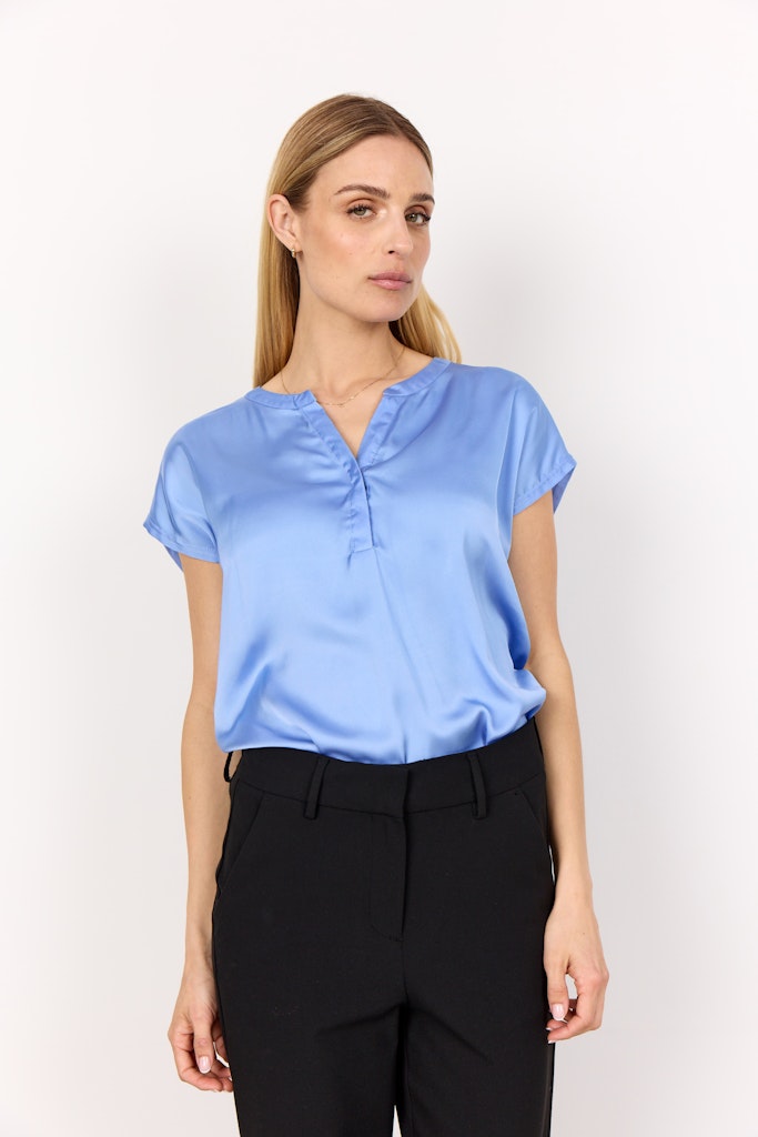 Die SC-THILDE 43 Bluse von SOYACONCEPT ist ein vielseitiges Basic, das in keiner Garderobe fehlen darf. Gefertigt aus angenehm leichter Viskose bietet sie ein seidiges Tragegefühl und eine fließende Passform. Der klassische V-Ausschnitt mit Knopfleiste und die kurzen Ärmel machen die Bluse zum perfekten Allrounder für Büro, Alltag und Freizeit. Erhältlich in den dezenten Farben Cream Beige und Hydrangea Blau – ideal zum Kombinieren mit Jeans, Röcken oder eleganten Stoffhosen.