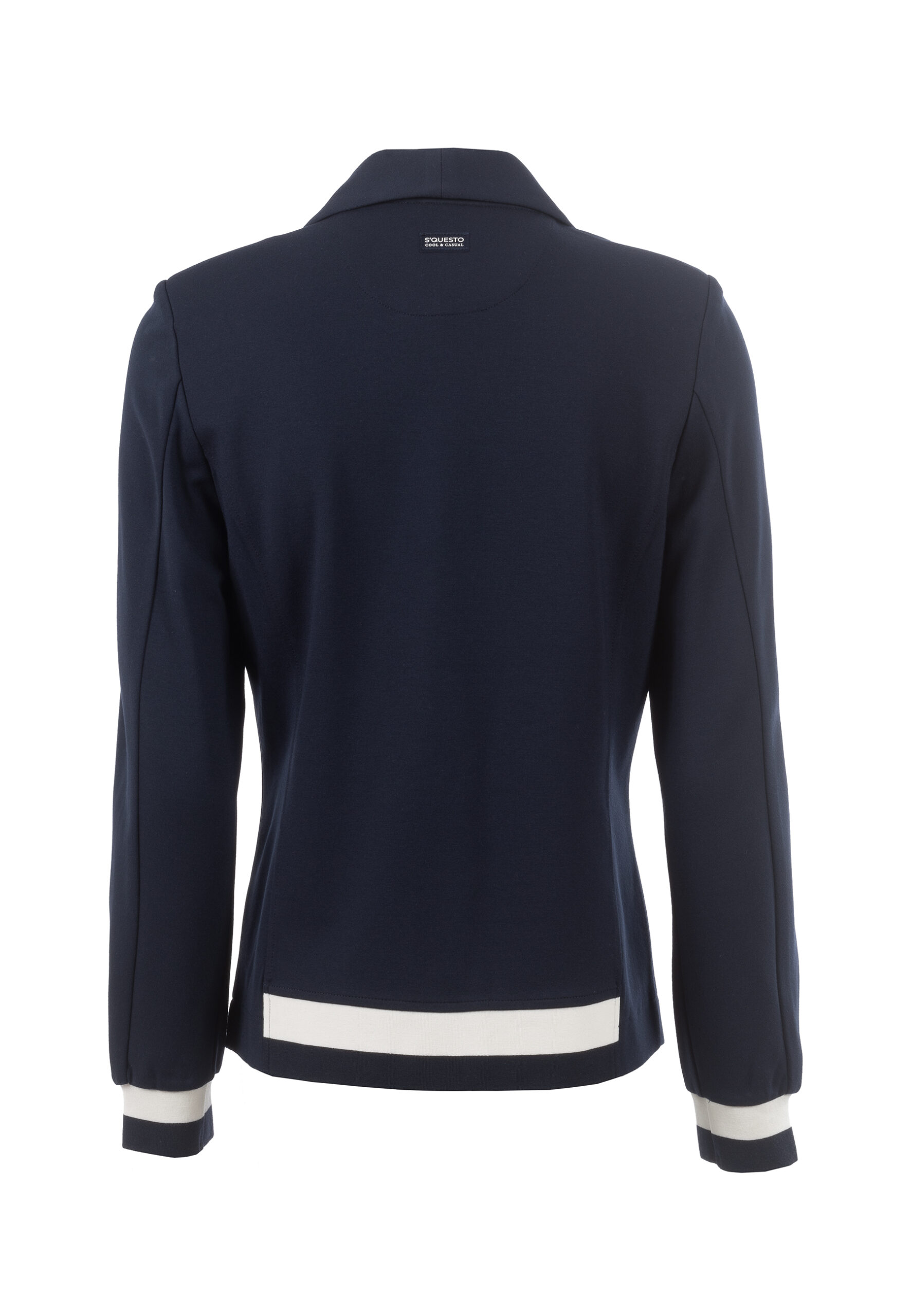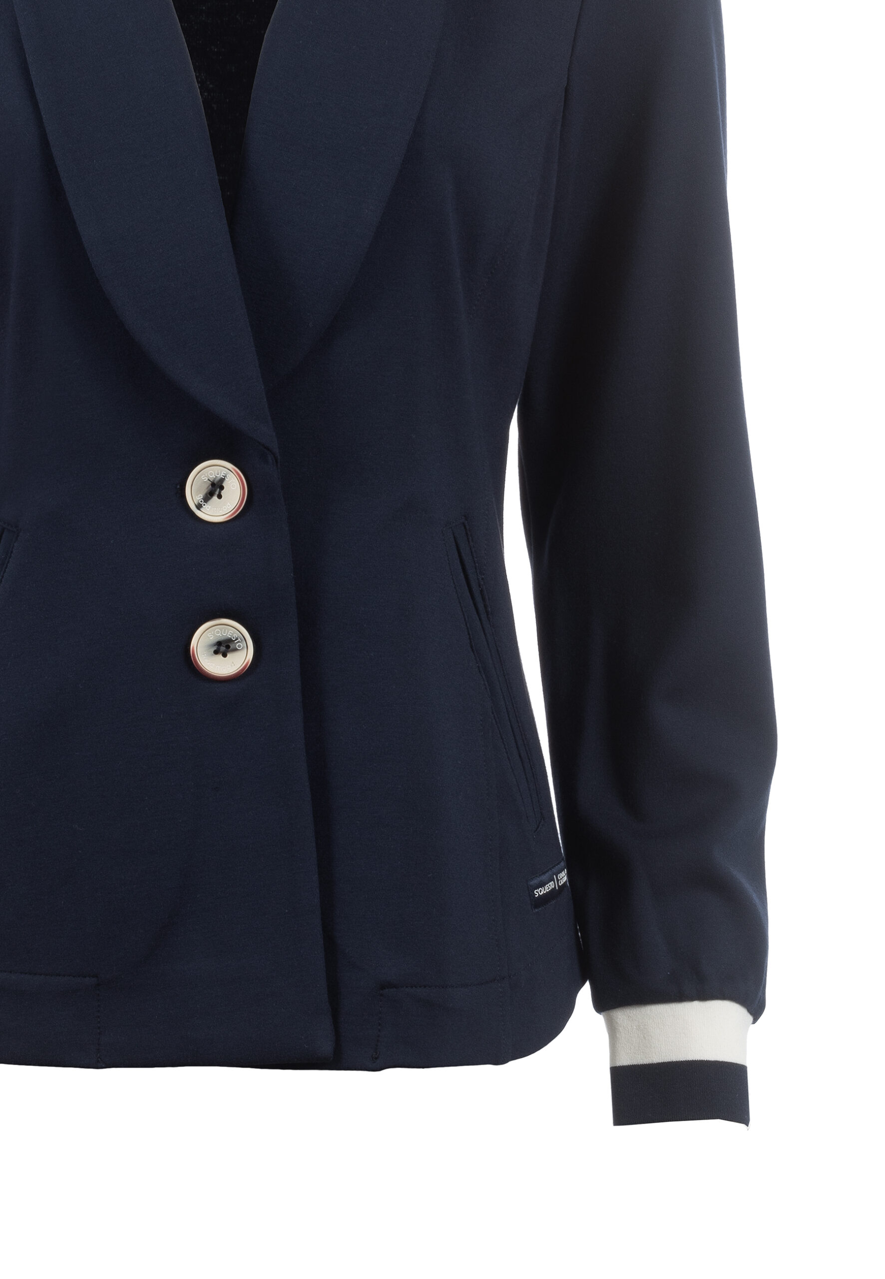 Sportiver, leichter Sweatblazer mit gestreiften, elastischen Rippbünden an den Ärmelenden und hinten am Saum. Für eine schöne Passform mit kleinen Schulterpolstern, zwei großen, melierten Knöpfen und länglichen Absteppungen vorne seitlich versehen.