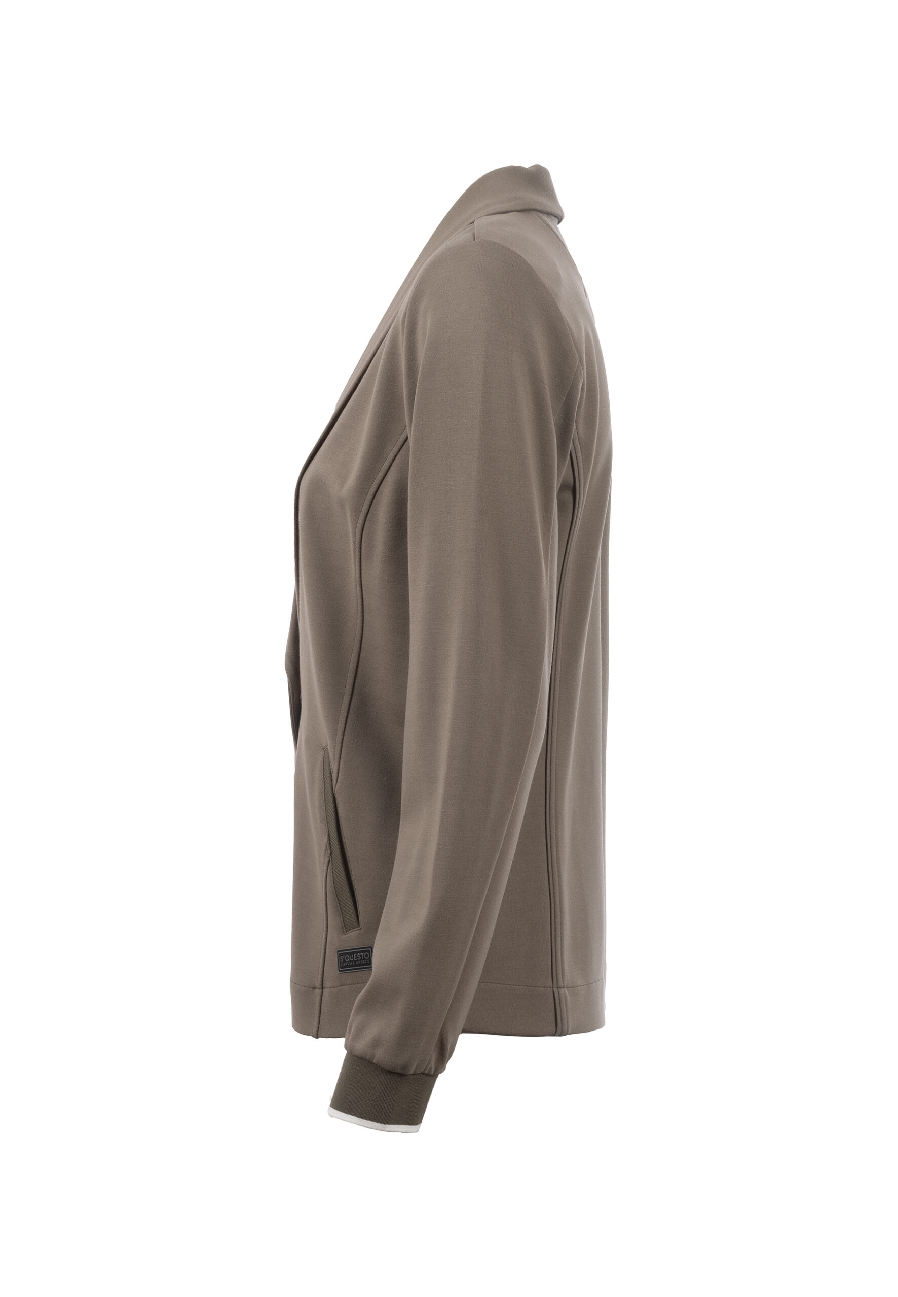 Weicher, elastischer Sweatblazer in Punti di Roma Qualität. Mit Schulterpolstern und zwei Druckknöpfen zum Schließen. Angedeutete Einschubtaschen und elastische Rippbündchen mit einem kontrastfarbenen Streifen runden den sportlich-eleganten Look ab.