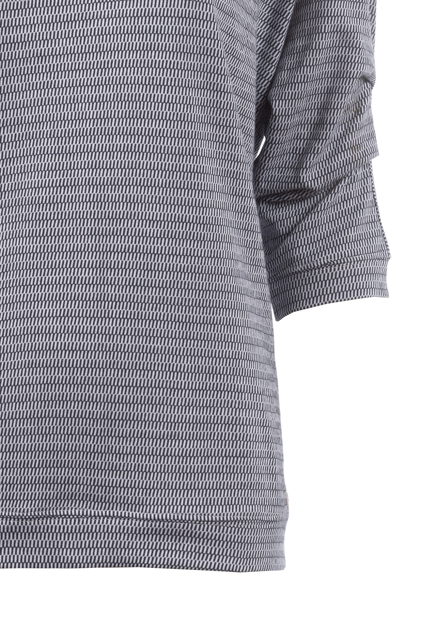 Leichtes Shirt mit überschnittenen, dreiviertel Ärmeln, die durch kleine Absteppungen eine Raffung erhalten. Das Eyecatching-Muster entsteht durch stukturierten Jersey. Mit einer kontrastfarbenen Ziernaht entlang der Seiten.