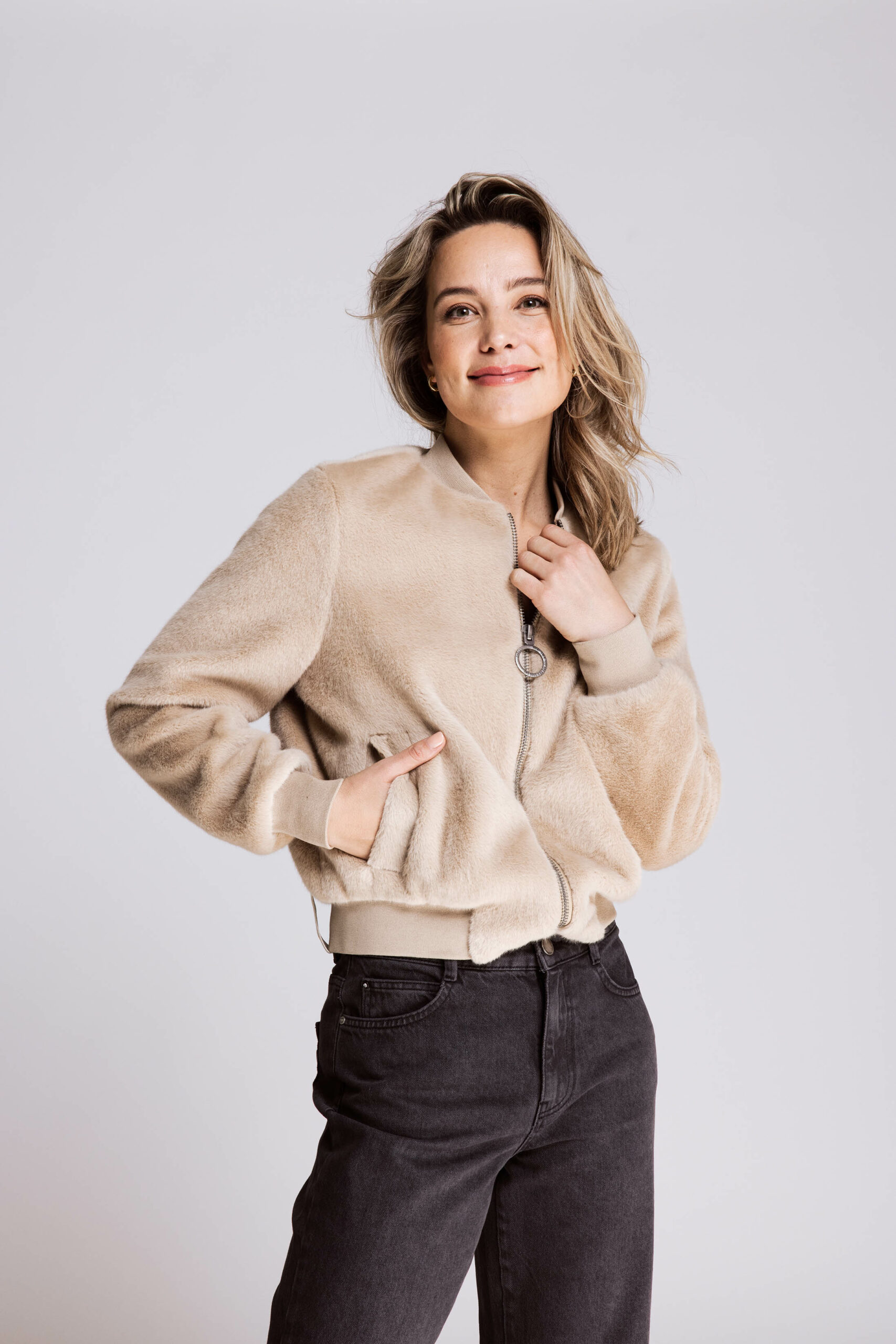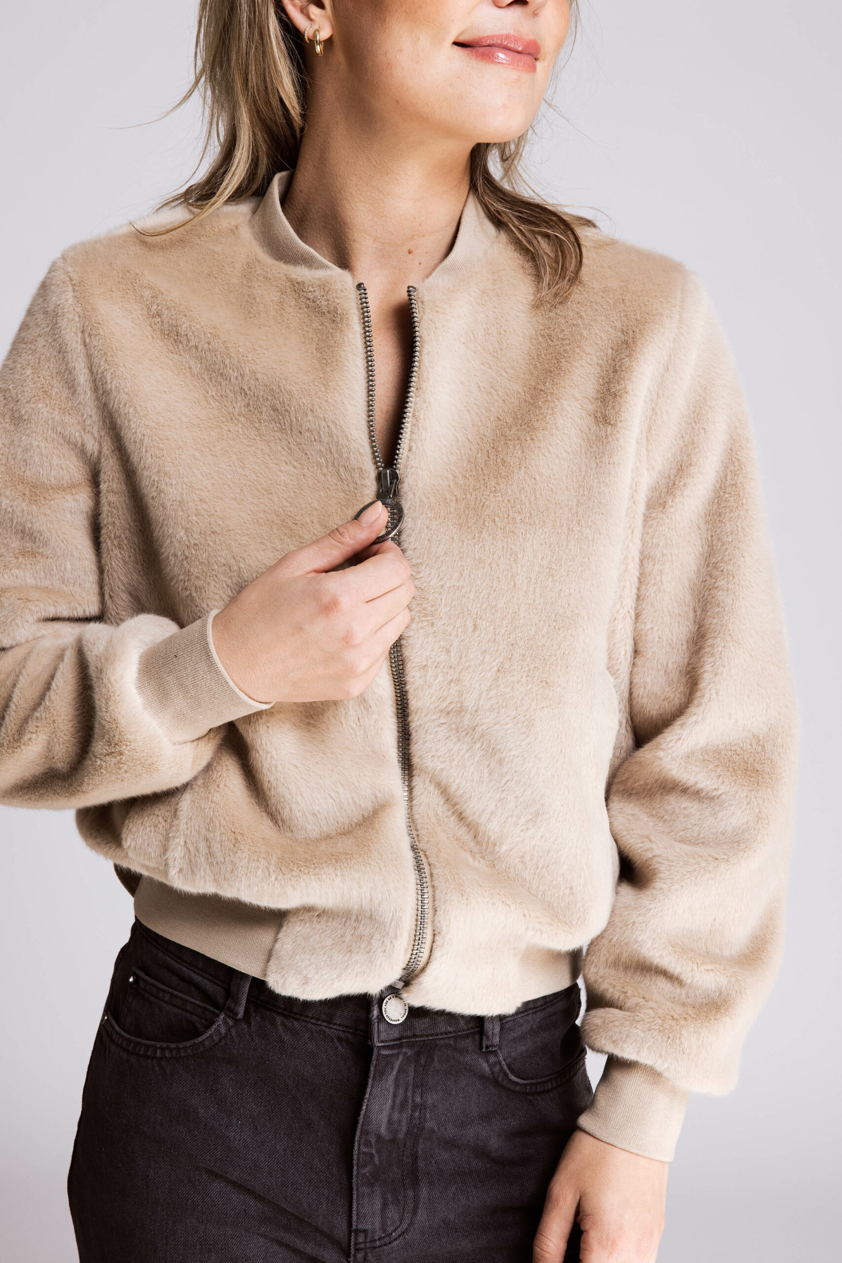 Trendthema Fake Fur als coolen Blouson umgesetzt von der Marke ZHRILL, College-Kragen, Bündchen, Kunstfell mit Reißverschluss.